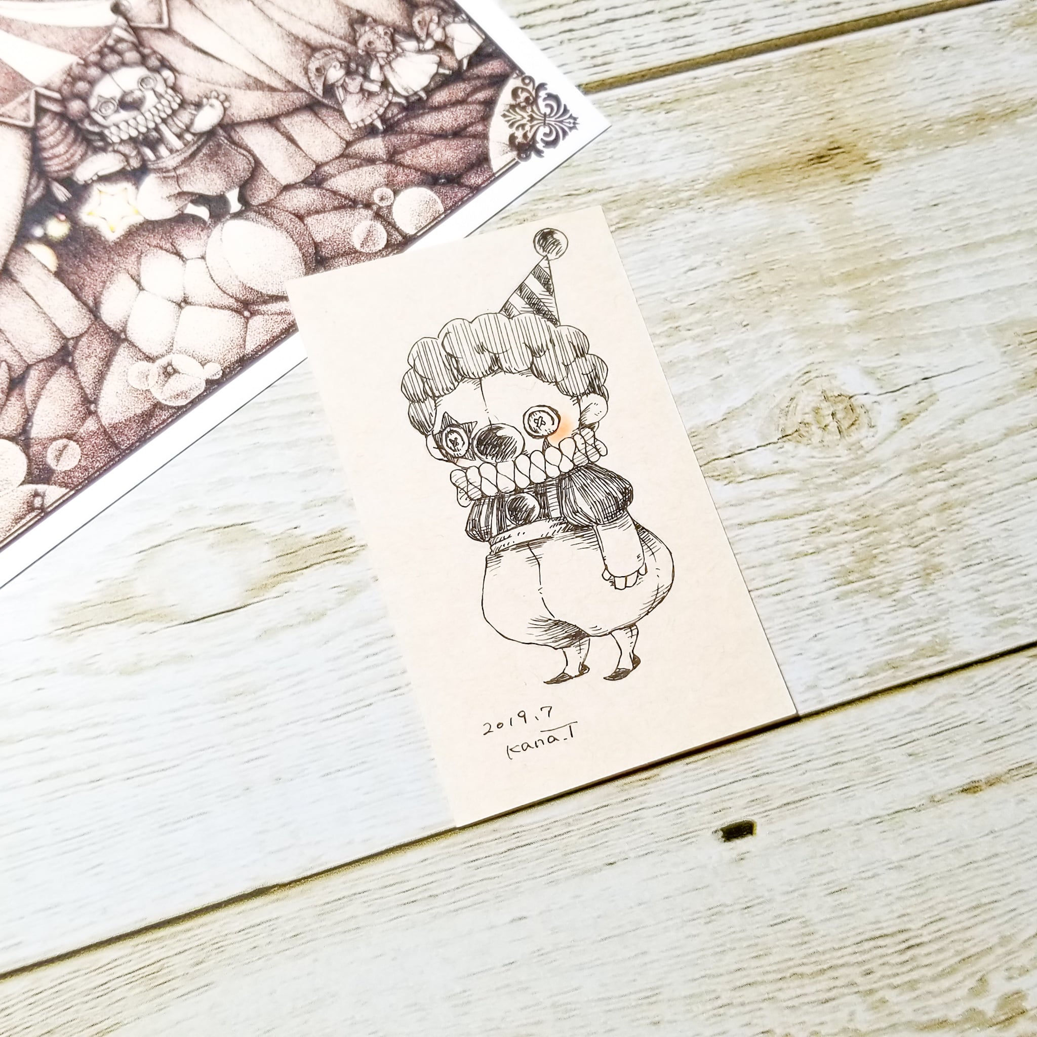 名刺サイズのミニ原画です。 オリジナルキャラクターのぬいぐる'sには様々な動物がいます。 今回はサーカスで暮らすピエロの子。 黄昏時に現れては不思議な夢を見せてくれる。 玉乗りが得意。 サイズ:55mm×91mm ケース:硬質塩化ビニル樹脂 ※送料込みの商品です。普通郵便にてお届けします。