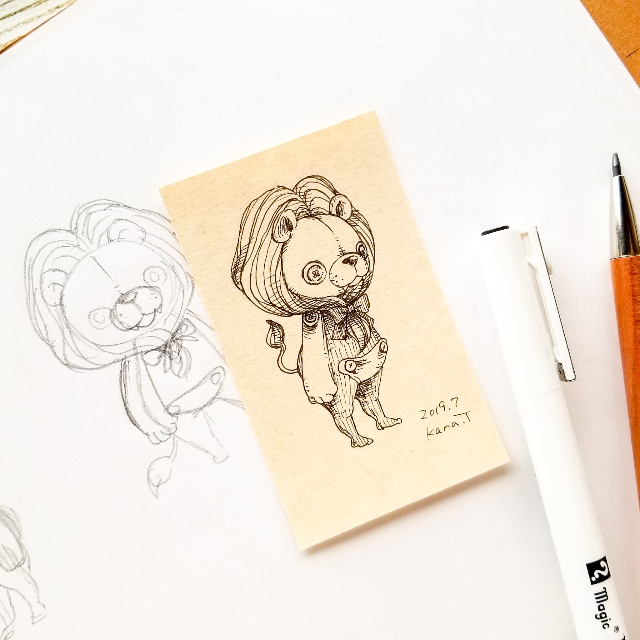 名刺サイズのミニ原画です。 オリジナルキャラクターのぬいぐる'sには様々な動物がいます。 今回は星座シリーズから獅子座の子。 百獣の王っぽいたてがみが自慢。 性格はのんびりで、らいおんの子と一緒に肉談義をするのが好き。 サイズ:55mm×91mm ケース:硬質塩化ビニル樹脂 ※送料込みの商品です。普通郵便にてお届けします。