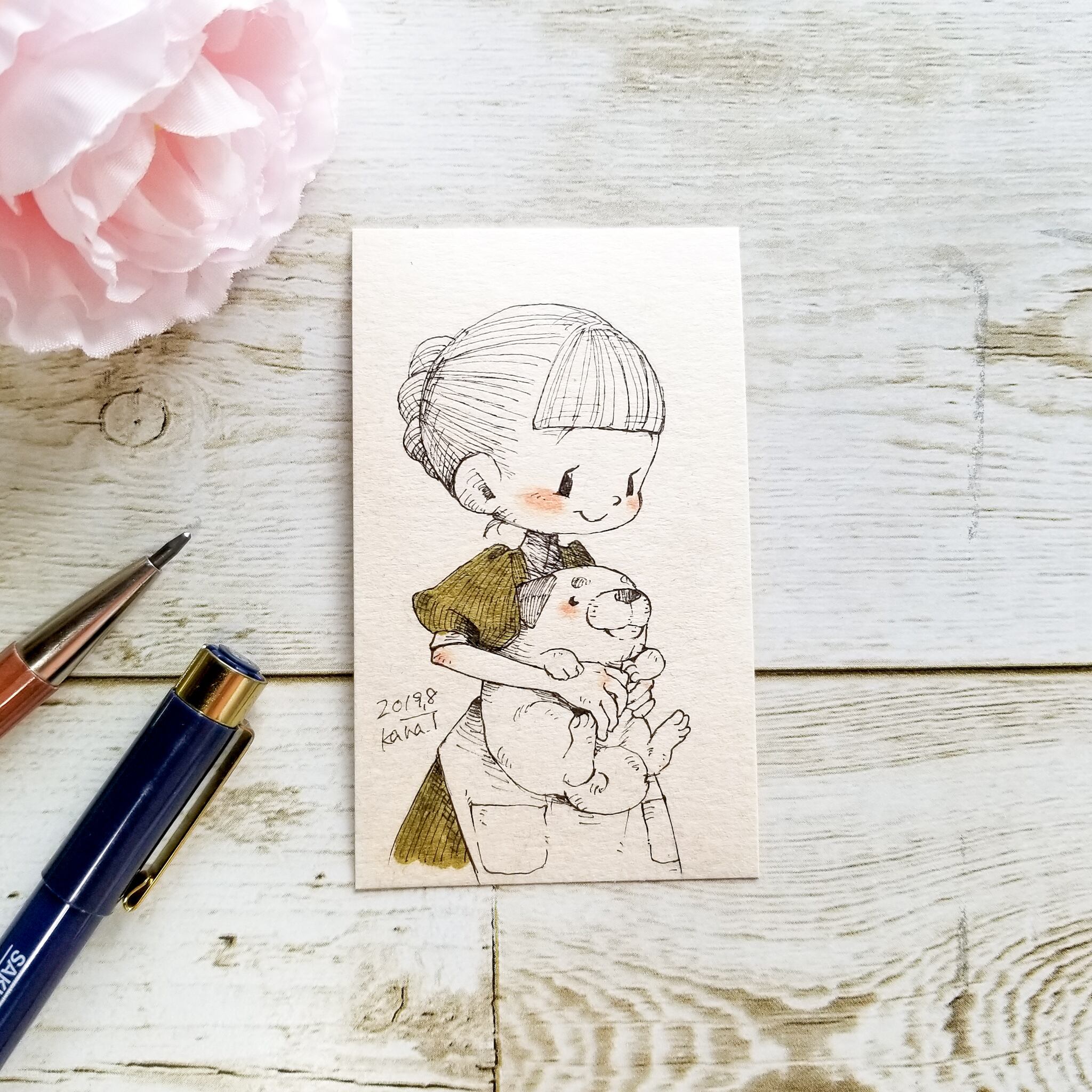 名刺サイズのミニ原画です。 メイドさんと愛犬のパグはいつでも一緒。 サイズ:55mm×91mm ケース:硬質塩化ビニル樹脂 ※送料込みの商品です。普通郵便にてお届けします。