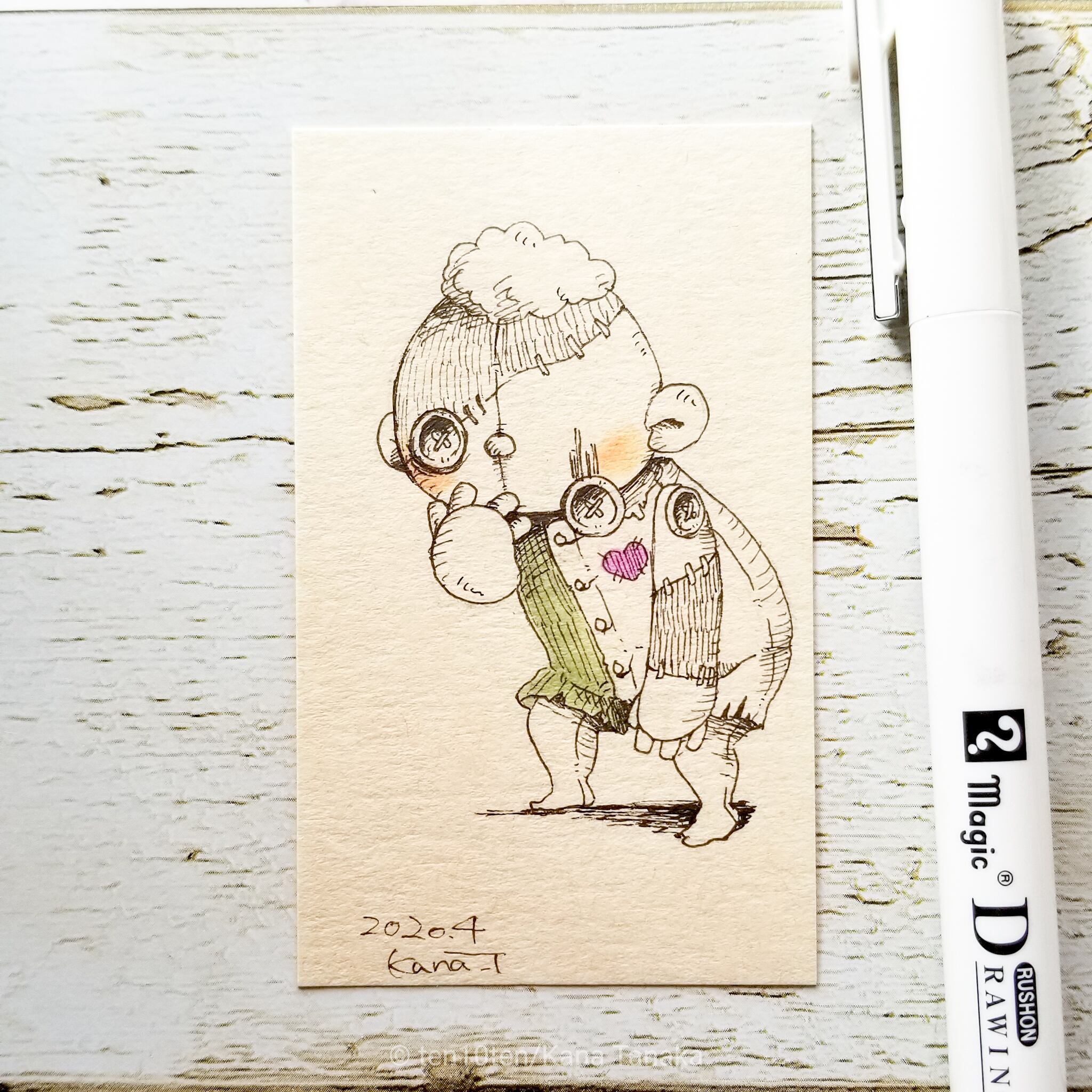名刺サイズのミニ原画です。 オリジナルキャラクターのぬいぐる'sには様々な生き物がいます。 今回はゾンビの子。 恥ずかしがり屋でいつもコソッと隠れている。 目が取れやすいのを気にしている。 サイズ:55mm×91mm ケース:硬質塩化ビニル樹脂 ※送料込みの商品です。普通郵便にてお届けします。