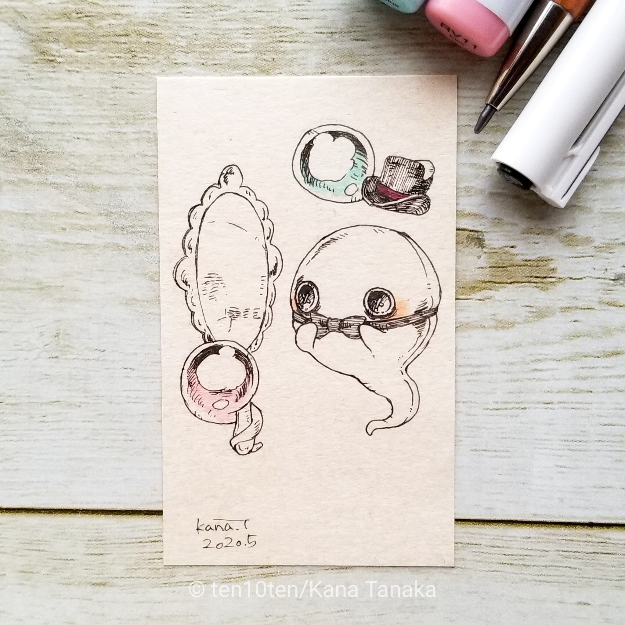 名刺サイズのドローイング作品です。 オリジナルキャラクターのぬいぐる'sには様々な生き物がいます。 今回はおばけ紳士。 朝はちょっと弱い紳士。 子どもたちがせっせと手伝ってくれます。 サイズ:55mm×91mm ケース:硬質塩化ビニル樹脂 ※送料込みの商品です。普通郵便にてお届けします。