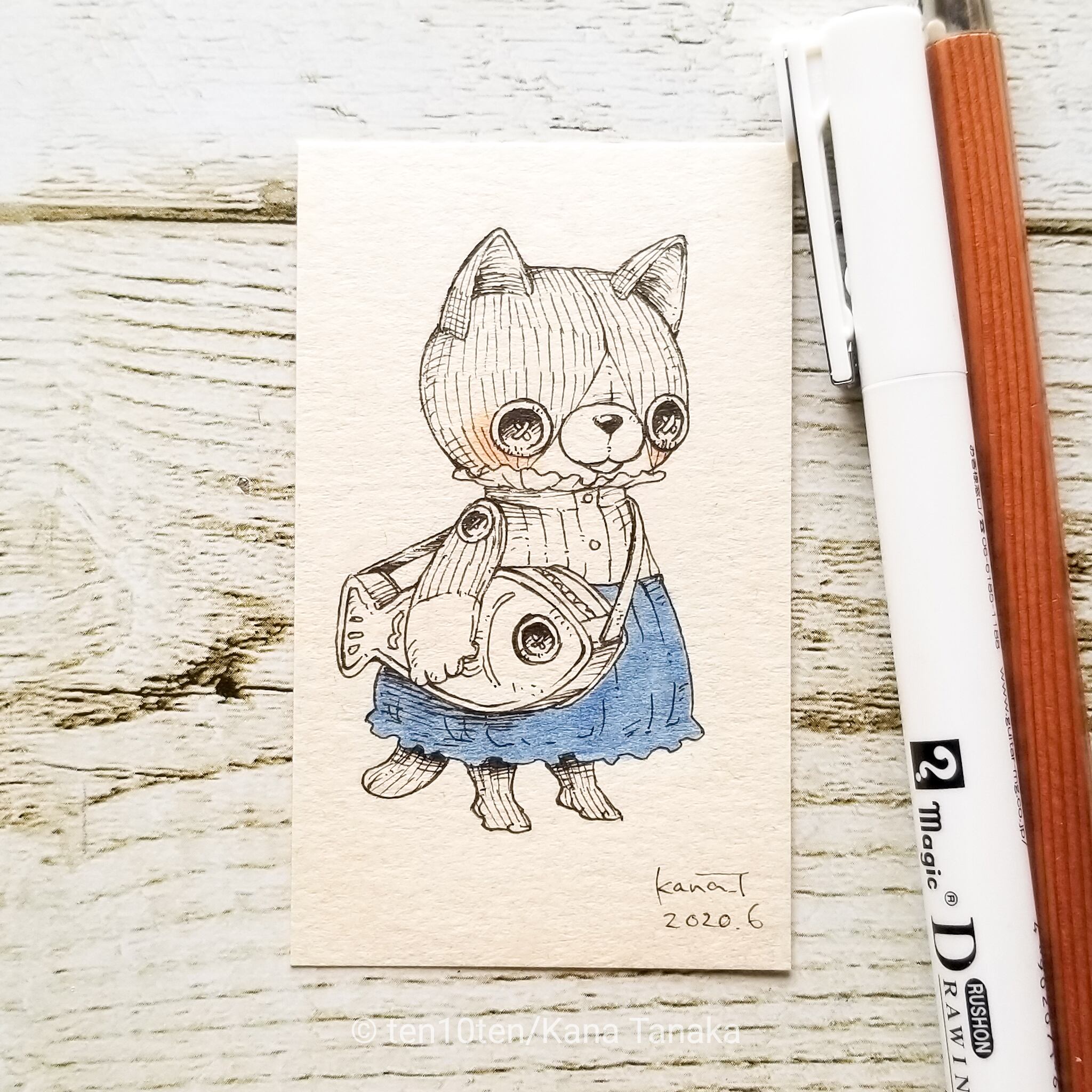 名刺サイズのドローイング作品です。 オリジナルキャラクターのぬいぐる'sには様々な生き物がいます。 今回はねこの子。 お気に入りの鞄を持って、今日はちょっとお出掛け。 サイズ:55mm×91mm ケース:硬質塩化ビニル樹脂 ※送料込みの商品です。普通郵便にてお届けします。