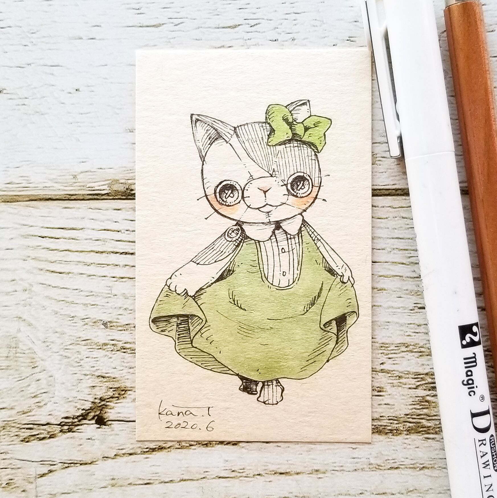 名刺サイズのミニ原画です。 オリジナルキャラクターのぬいぐる'sには様々な動物がいます。 今回はねこの子。 ねこの子には色々な模様のおしゃれな子たちが沢山います。 お気に入りの若草色のワンピースを着こなすぶちねこの子。 サイズ:55mm×91mm ケース:硬質塩化ビニル樹脂 ※送料込みの商品です。普通郵便にてお届けします。