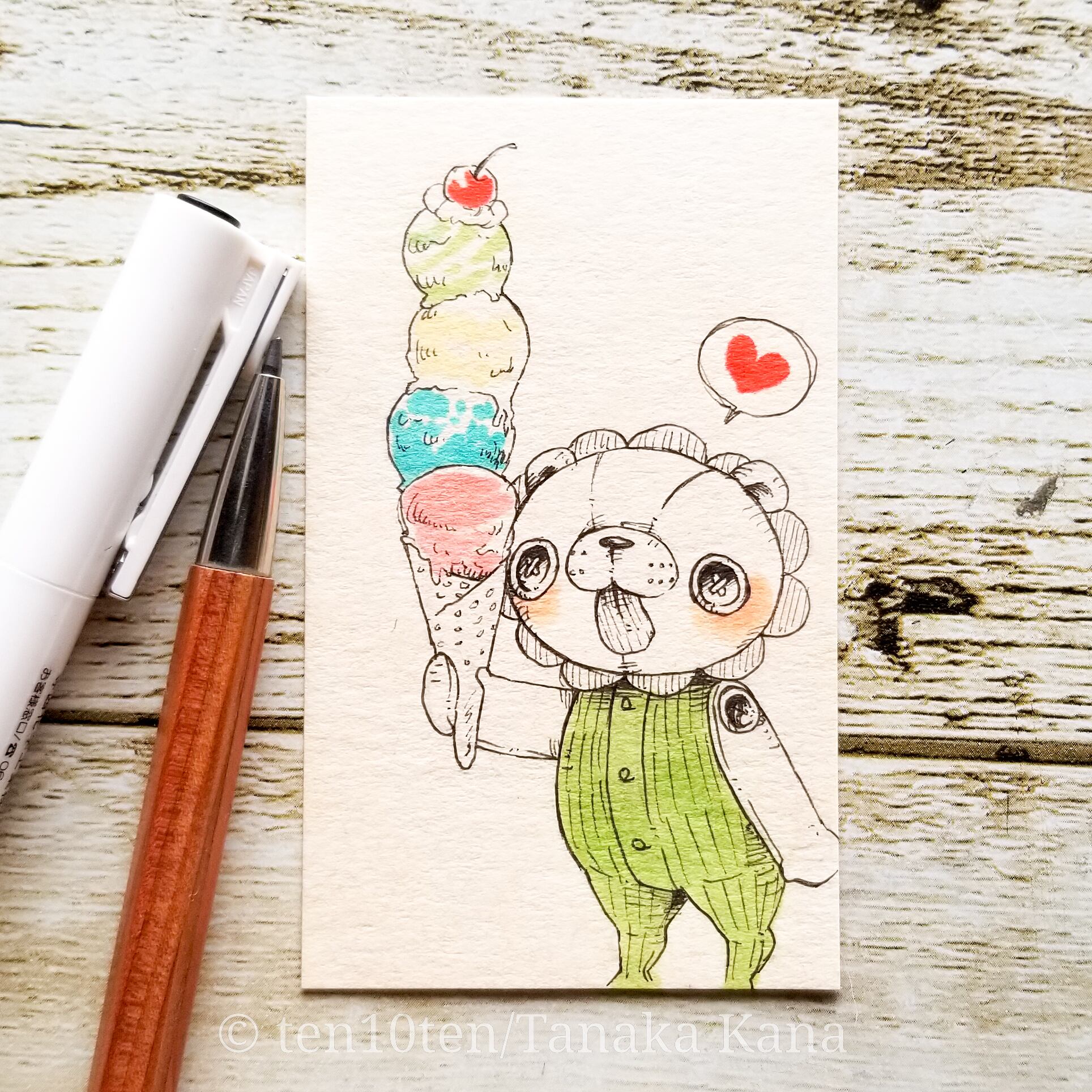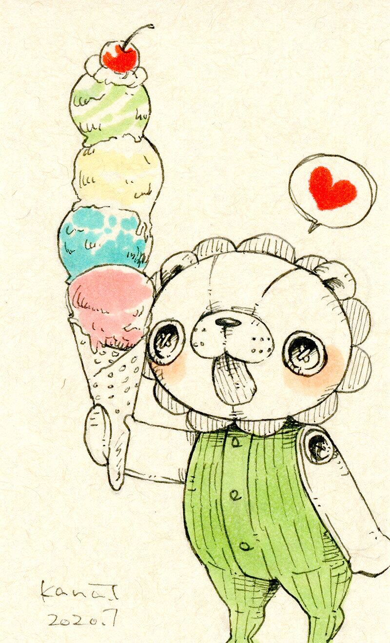 名刺サイズのミニ原画です。 オリジナルキャラクターのぬいぐる'sには様々な動物がいます。 今回はライオンの子。 食いしん坊のライオンの子は、アイスは最低でも4段はほしいところ。 大好きなアイス屋さんはトッピングも最高。 サイズ:55mm×91mm ケース:硬質塩化ビニル樹脂 ※送料込みの商品です。普通郵便にてお届けします。
