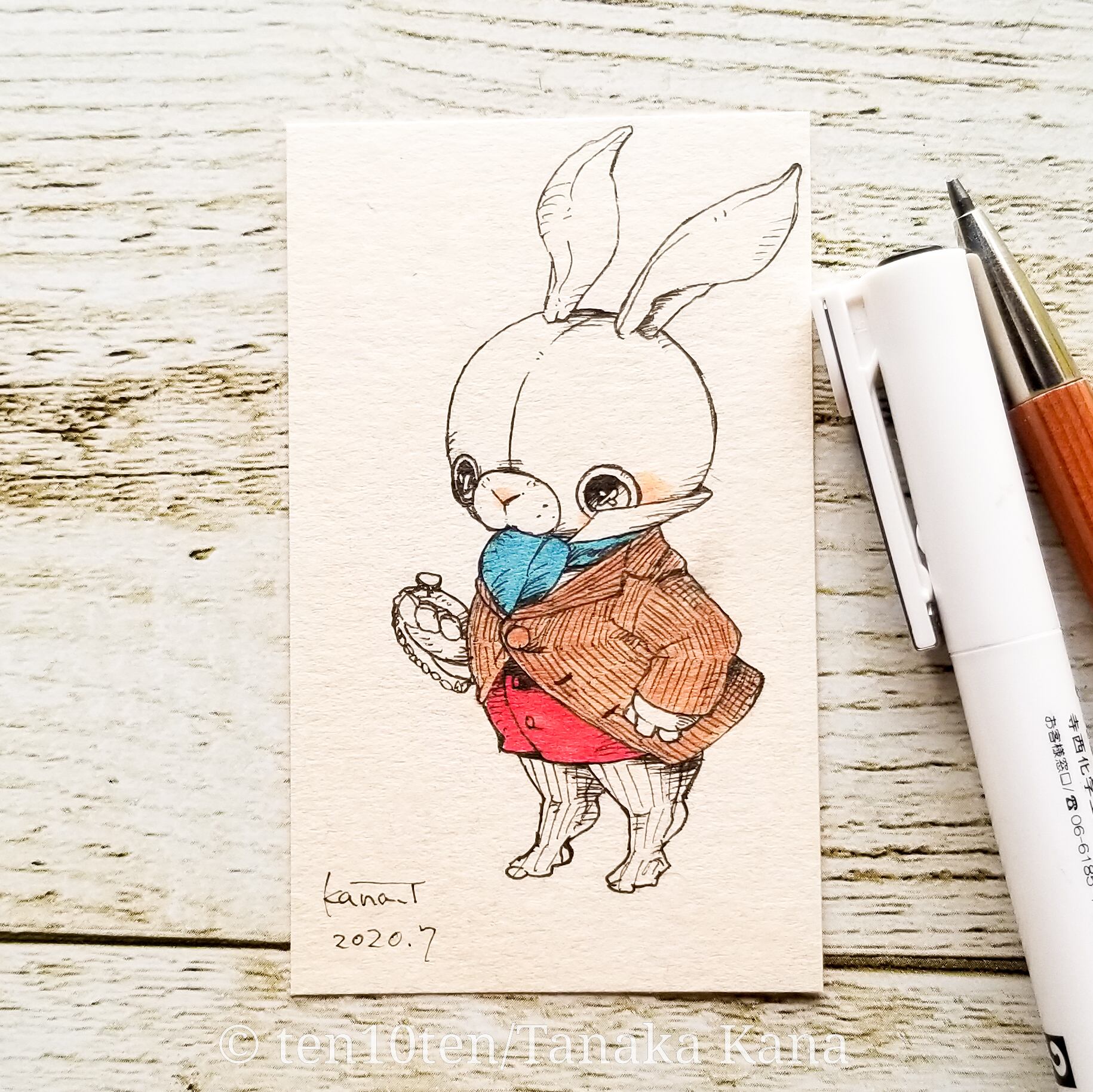名刺サイズのミニ原画です。 オリジナルキャラクターのぬいぐる'sには様々な生き物がいます。 今回は時計うさぎの子。 不思議の国に住むうさぎ。 いつも時計を見ては急いでいる。 サイズ:55mm×91mm ケース:硬質塩化ビニル樹脂 ※送料込みの商品です。普通郵便にてお届けします。
