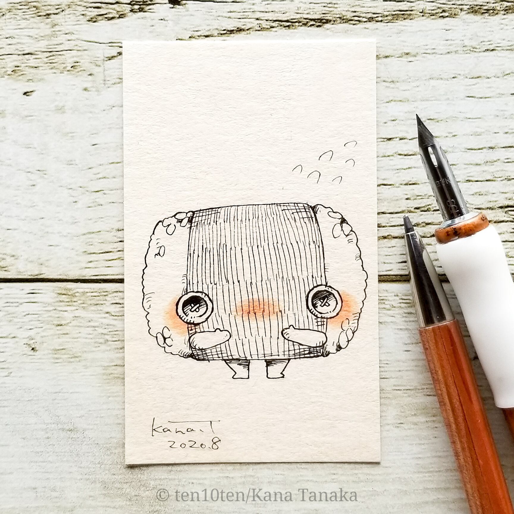 名刺サイズのドローイング作品です。 オリジナルキャラクターのぬいぐる'sには様々な動物がいます。 今回は俵むすびの子。 小さな子のお弁当によく入っている人気者。 海苔むすびの子の弟分。 サイズ:55mm×91mm ケース:硬質塩化ビニル樹脂 ※送料込みの商品です。普通郵便にてお届けします。