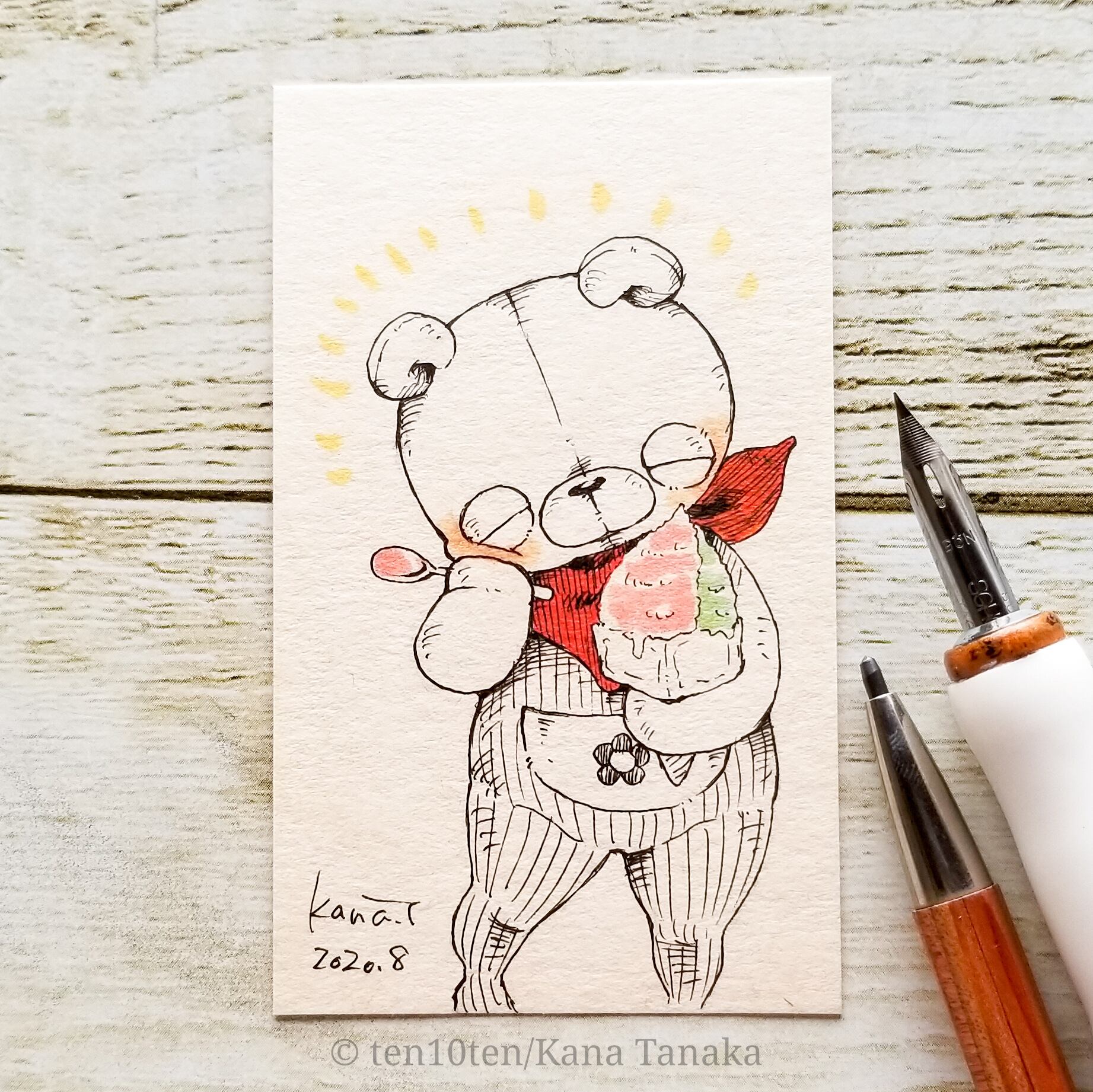 名刺サイズのドローイング作品です。 ぬいぐる’sと巡る今日は何の日。 今日はジェラートの日。 美味しいジェラートを食べて暑さを遠ざけましょう~。 サイズ:55mm×91mm ケース:硬質塩化ビニル樹脂 ※送料込みの商品です。普通郵便にてお届けします。
