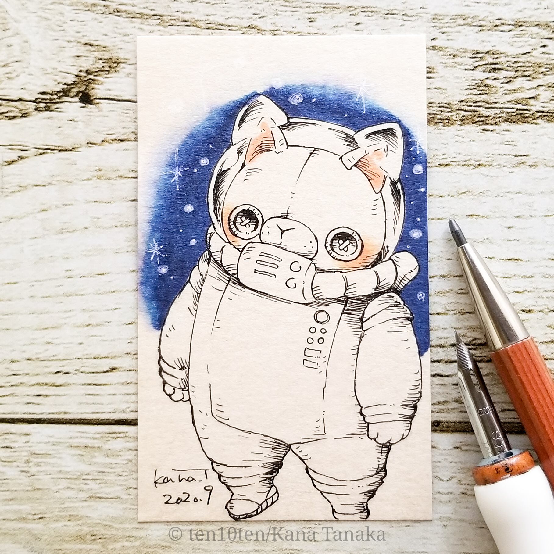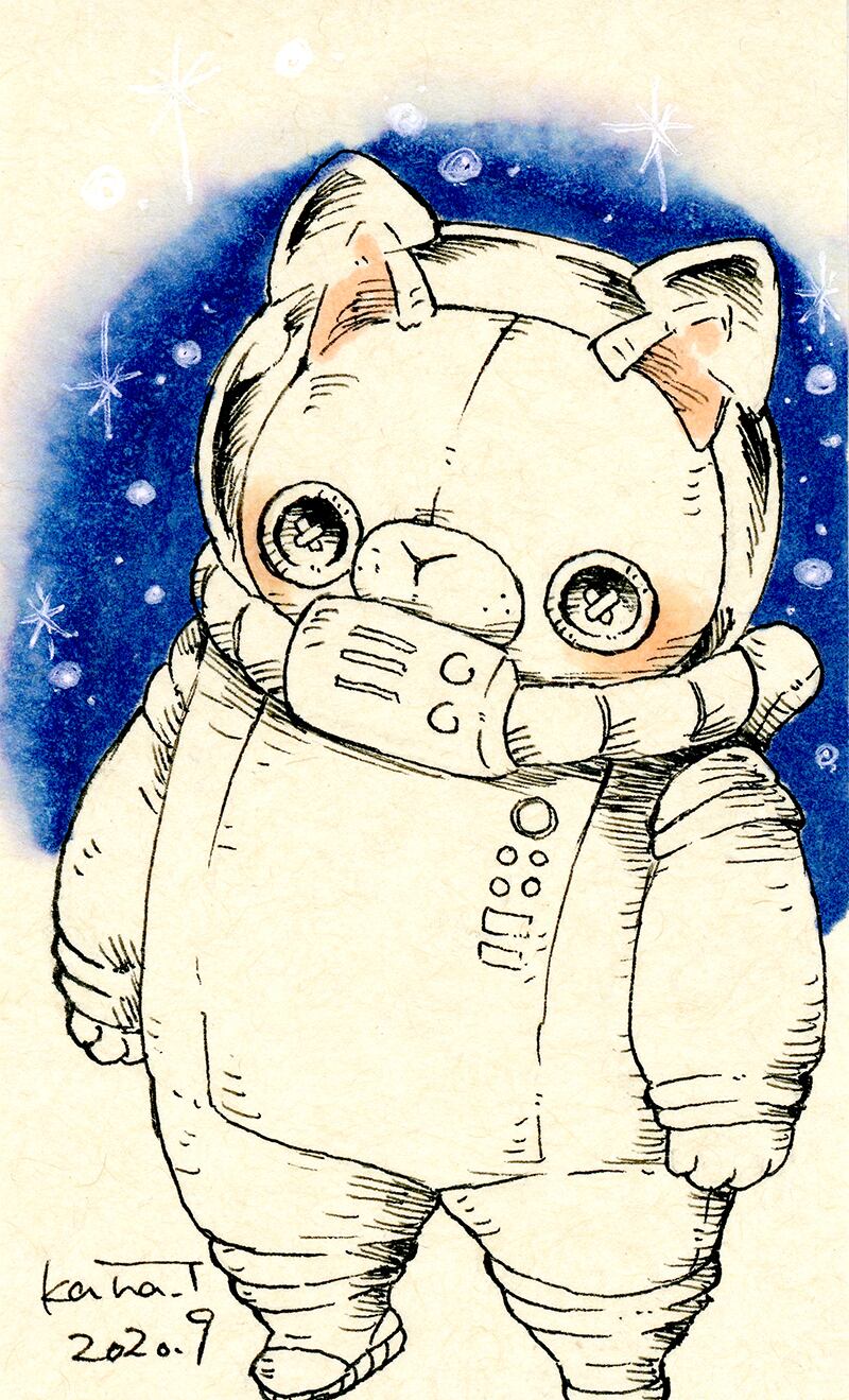 名刺サイズのドローイング作品です。 ぬいぐる’sと巡る今日は何の日。 今日は宇宙の日。 数年前に作ったレジン作品に宇宙を旅する猫をモチーフにした人気商品がありました。 宇宙に旅立った猫は、どんな冒険をしたのでしょうか。 サイズ:55mm×91mm ケース:硬質塩化ビニル樹脂 ※送料込みの商品です。普通郵便にてお届けします。