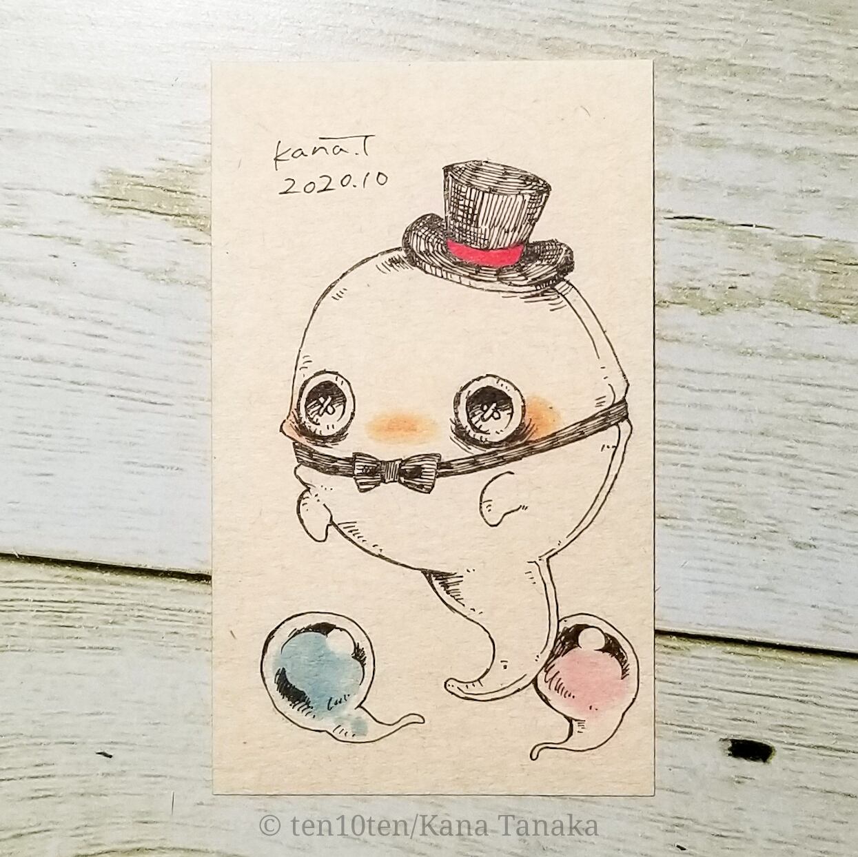 名刺サイズのドローイング作品です。 オリジナルキャラクターのぬいぐる'sには様々な生き物がいます。 今回はオバケ紳士。 子どもたちと一緒に年に一度の大忙し。 サイズ:55mm×91mm ケース:硬質塩化ビニル樹脂 ※送料込みの商品です。普通郵便にてお届けします。
