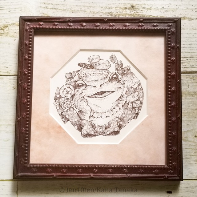 お菓子に囲まれて サイズ:約17cm×17cm(額装含む) 額装:木、アクリル [取り扱いについて] 飾る際には直射日光を避けていただき、保管する際には高温多湿を避けて暗所に保管をお願いします。 特に、直射日光が当たると退色が早く、長く作品を楽しめなくなる可能性がございます。