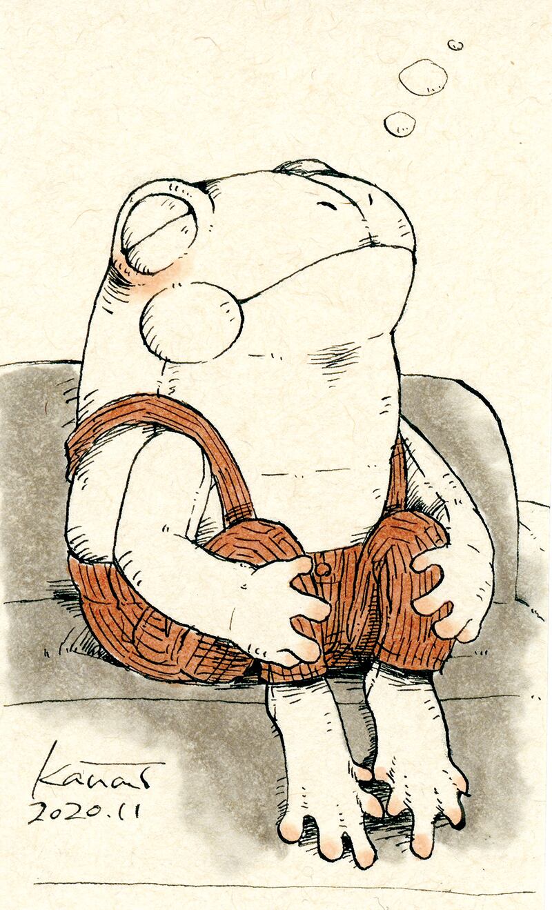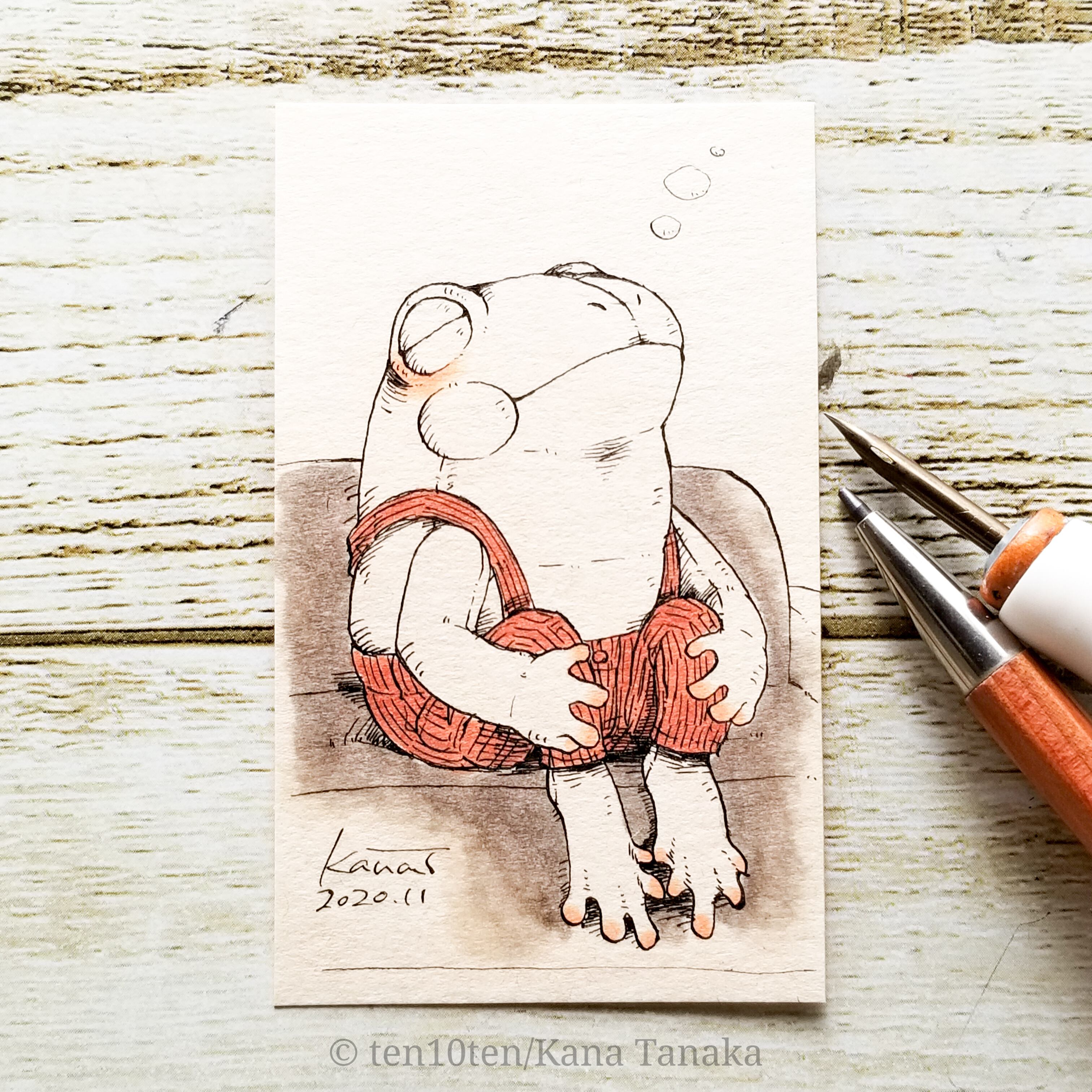 名刺サイズのドローイング作品です。 ぬいぐる'sには色々な生き物がいます。 今回はけろリーマン。 けろリーマンはちょっとだけ都会暮らしのカエル。 休日はお気に入りの日当たりの良いソファでのんびり過ごす。 サイズ:55mm×91mm ケース:硬質塩化ビニル樹脂 ※送料込みの商品です。普通郵便にてお届けします。