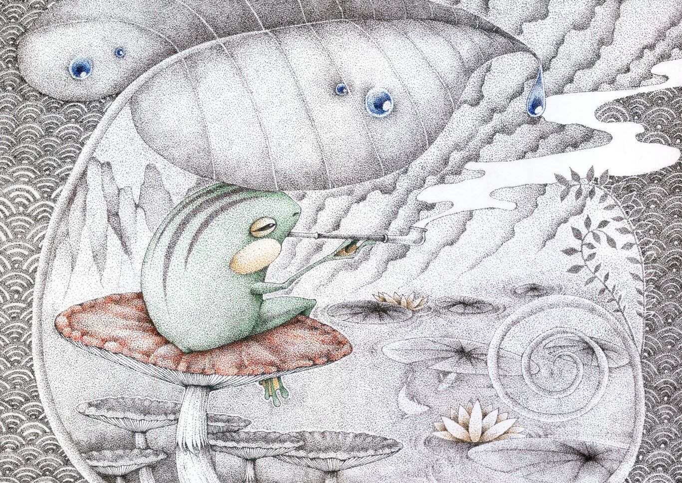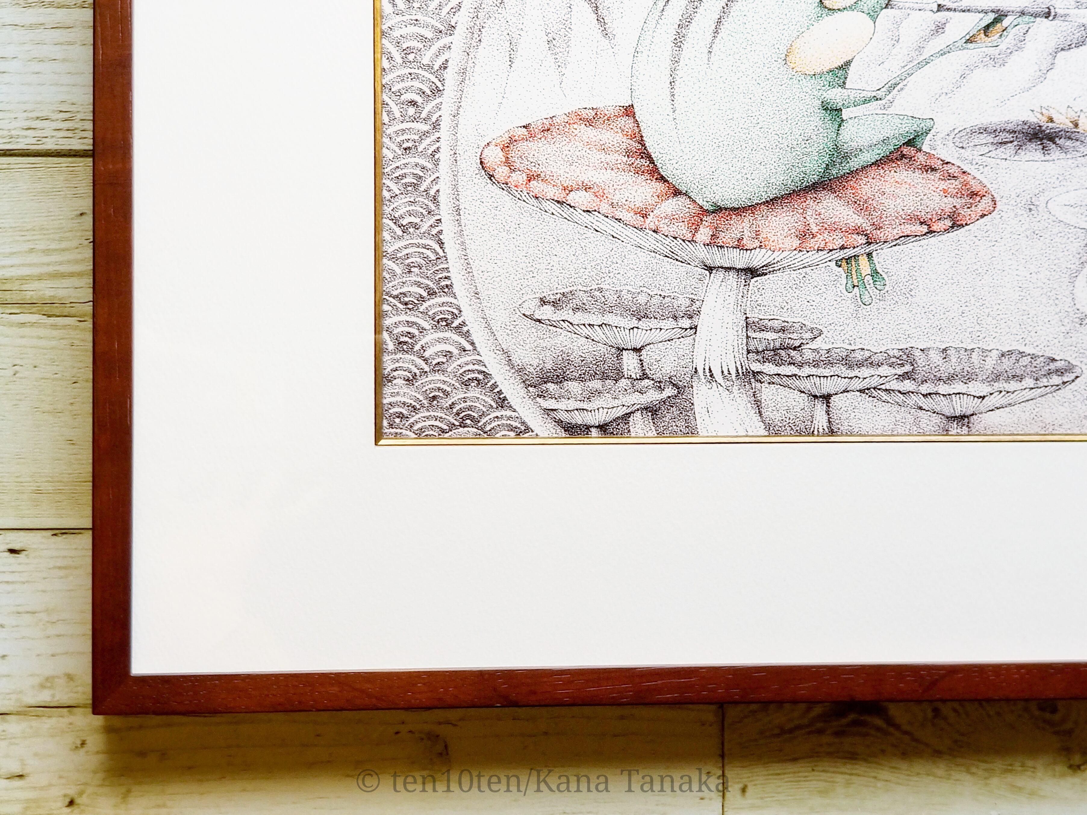 きのこの上からの眺めは、至福の一服をもたらす。 サイズ:約B4サイズ(36.4cm×25.7cm)(額装含まず) 額装:木、アクリル [取り扱いについて] 飾る際には直射日光を避けていただき、保管する際には高温多湿を避けて暗所に保管をお願いします。 特に、直射日光が当たると退色が早く、長く作品を楽しめなくなる可能性がございます。