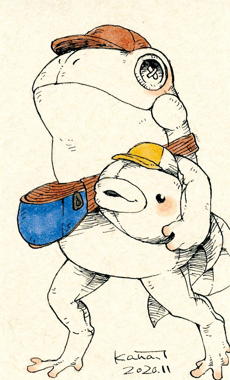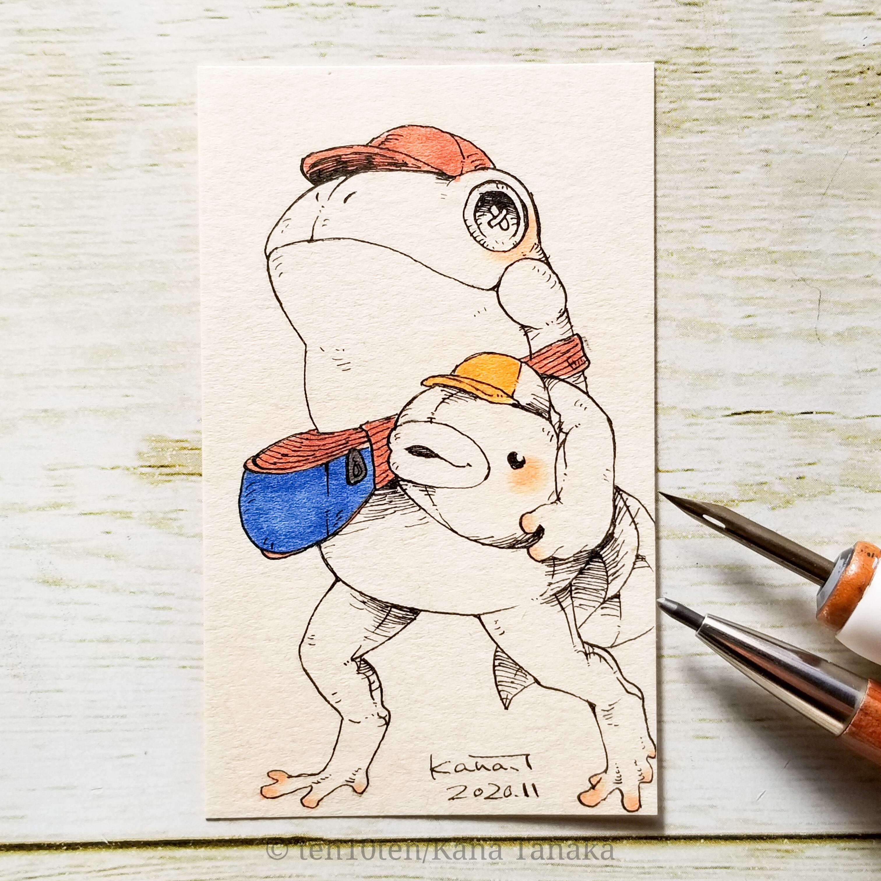 名刺サイズのドローイング作品です。 オリジナルキャラクターのぬいぐる'sには様々な生き物がいます。 今回はけろリーマン。 休日には甥っ子とお出掛け。 サイズ:55mm×91mm ケース:硬質塩化ビニル樹脂 ※送料込みの商品です。普通郵便にてお届けします。