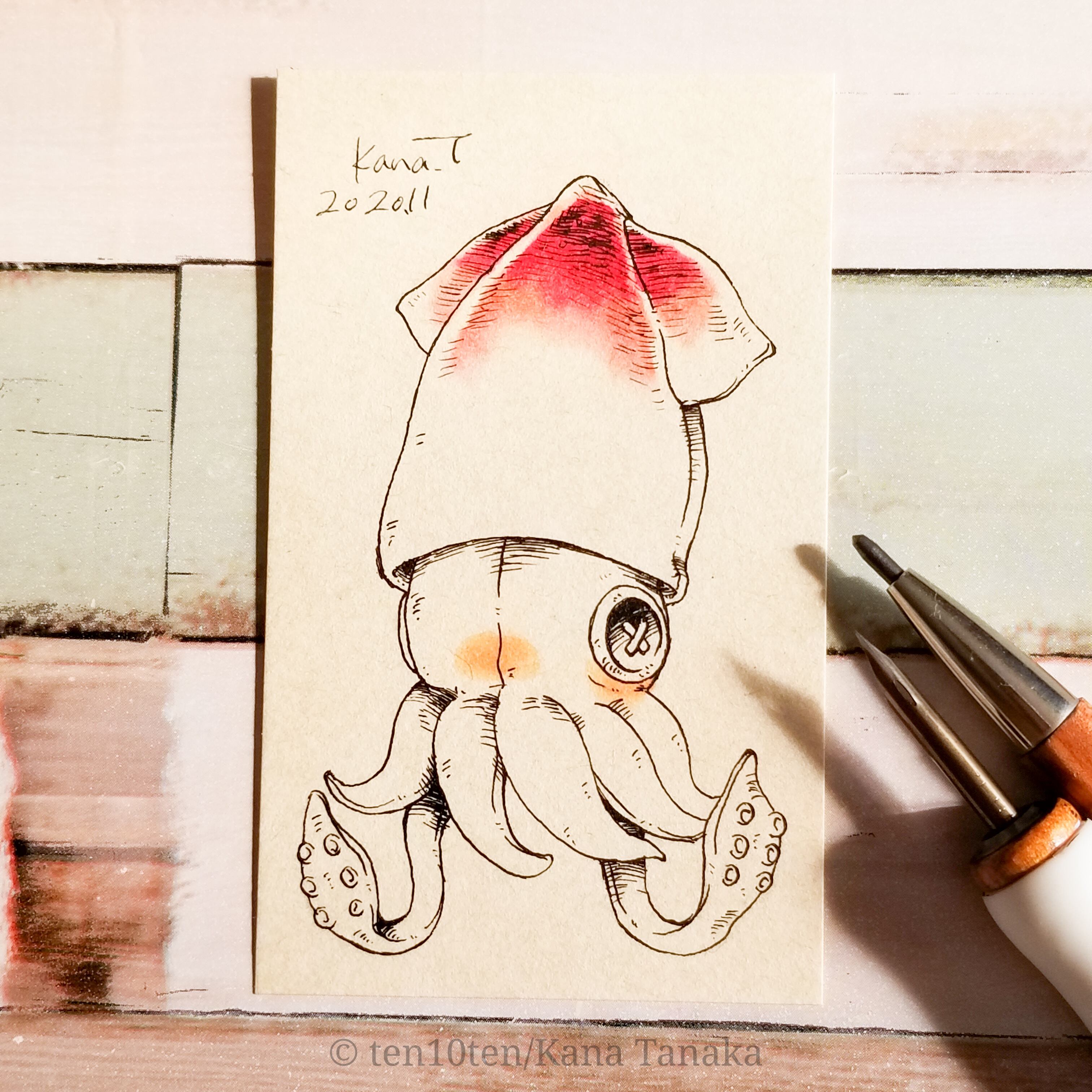 名刺サイズのドローイング作品です。 オリジナルキャラクターのぬいぐる'sには様々な生き物がいます。 今回はイカの子。 ダイオウイカに憧れている。 サイズ:55mm×91mm ケース:硬質塩化ビニル樹脂 ※送料込みの商品です。普通郵便にてお届けします。