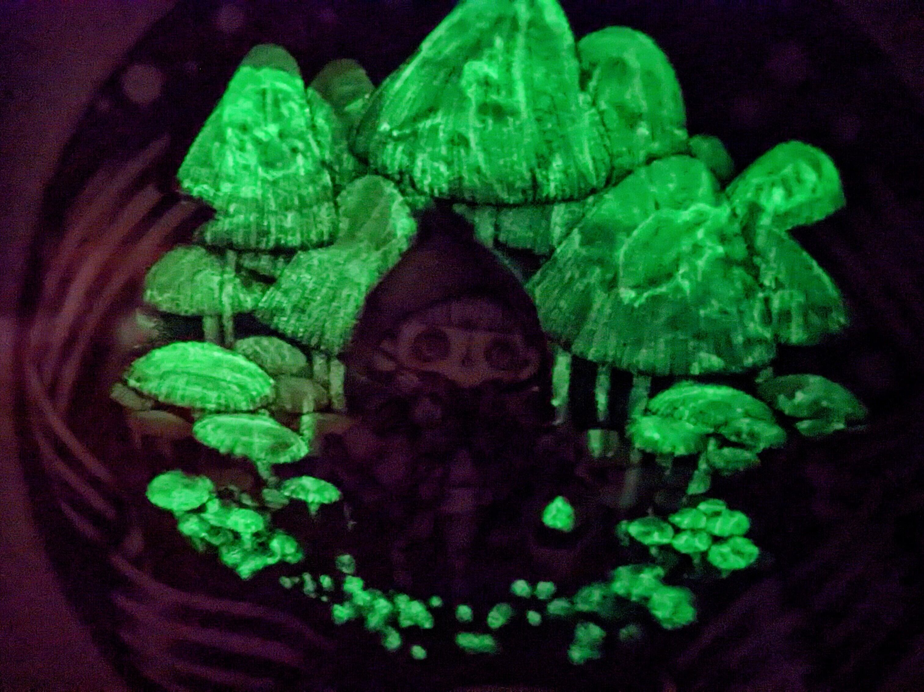 蓄光塗料を使用し、暗闇で光るきのこを再現しています。
