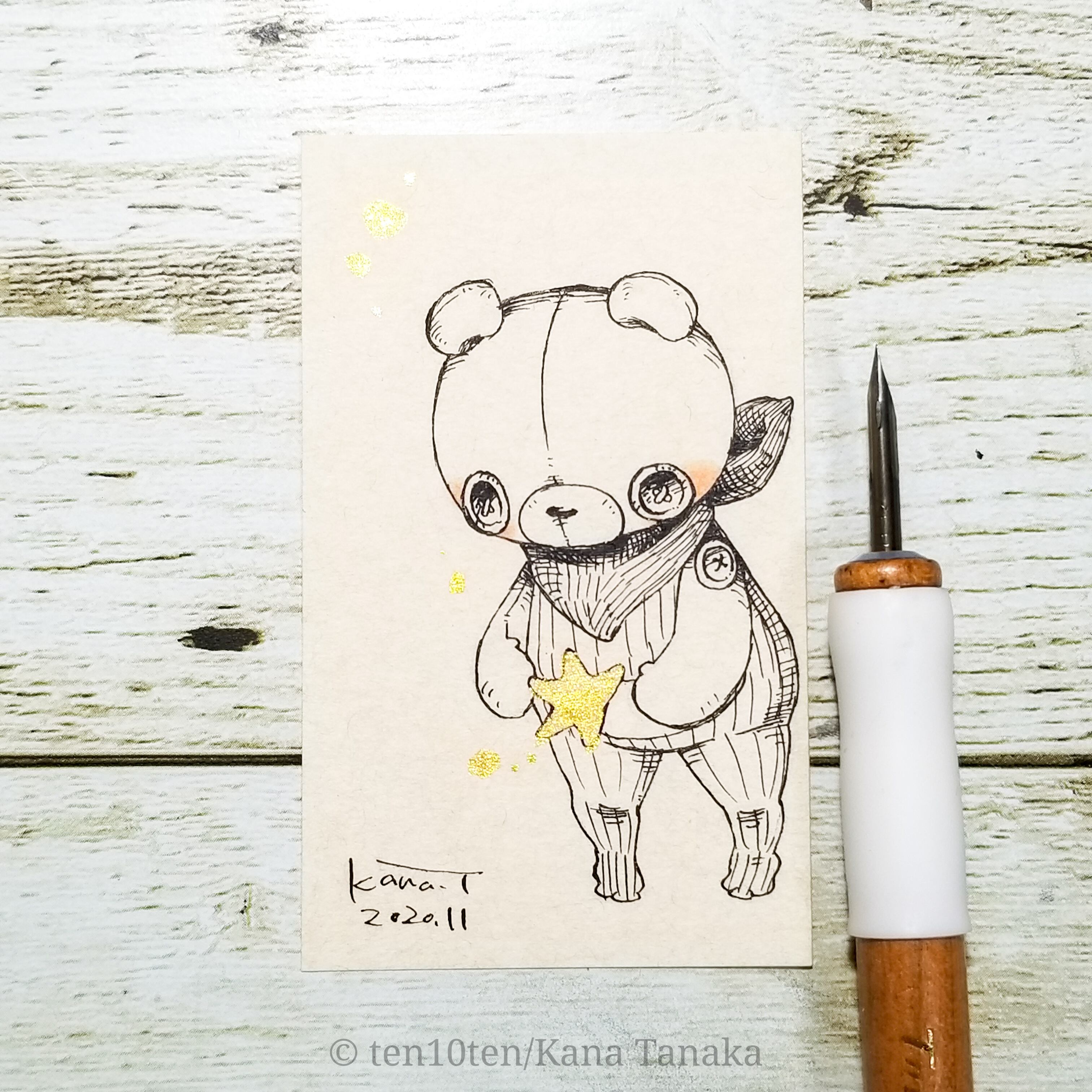 名刺サイズのドローイング作品です。 オリジナルキャラクターのぬいぐる'sには様々な生き物がいます。 今回はくまの子。 夜にだけ会えるともだち。 キラキラ光る君とダンス。 サイズ:55mm×91mm ケース:硬質塩化ビニル樹脂 ※送料込みの商品です。普通郵便にてお届けします。