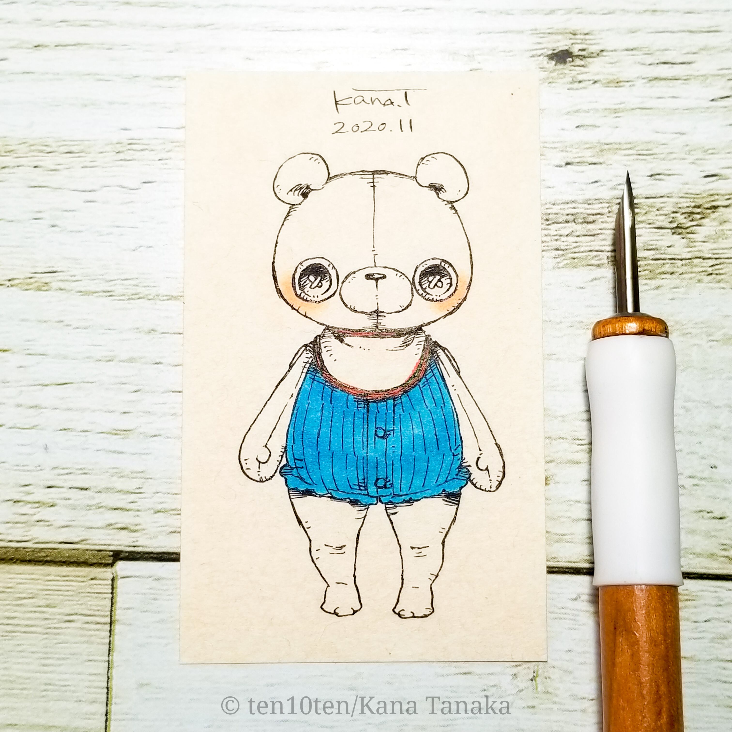 名刺サイズのドローイング作品です。 オリジナルキャラクターのぬいぐる'sには様々な生き物がいます。 今回はくまの子。 夏用のお洋服。 レギンスを合わせたり、ズボンを重ねたり。 サイズ:55mm×91mm ケース:硬質塩化ビニル樹脂 ※送料込みの商品です。普通郵便にてお届けします。