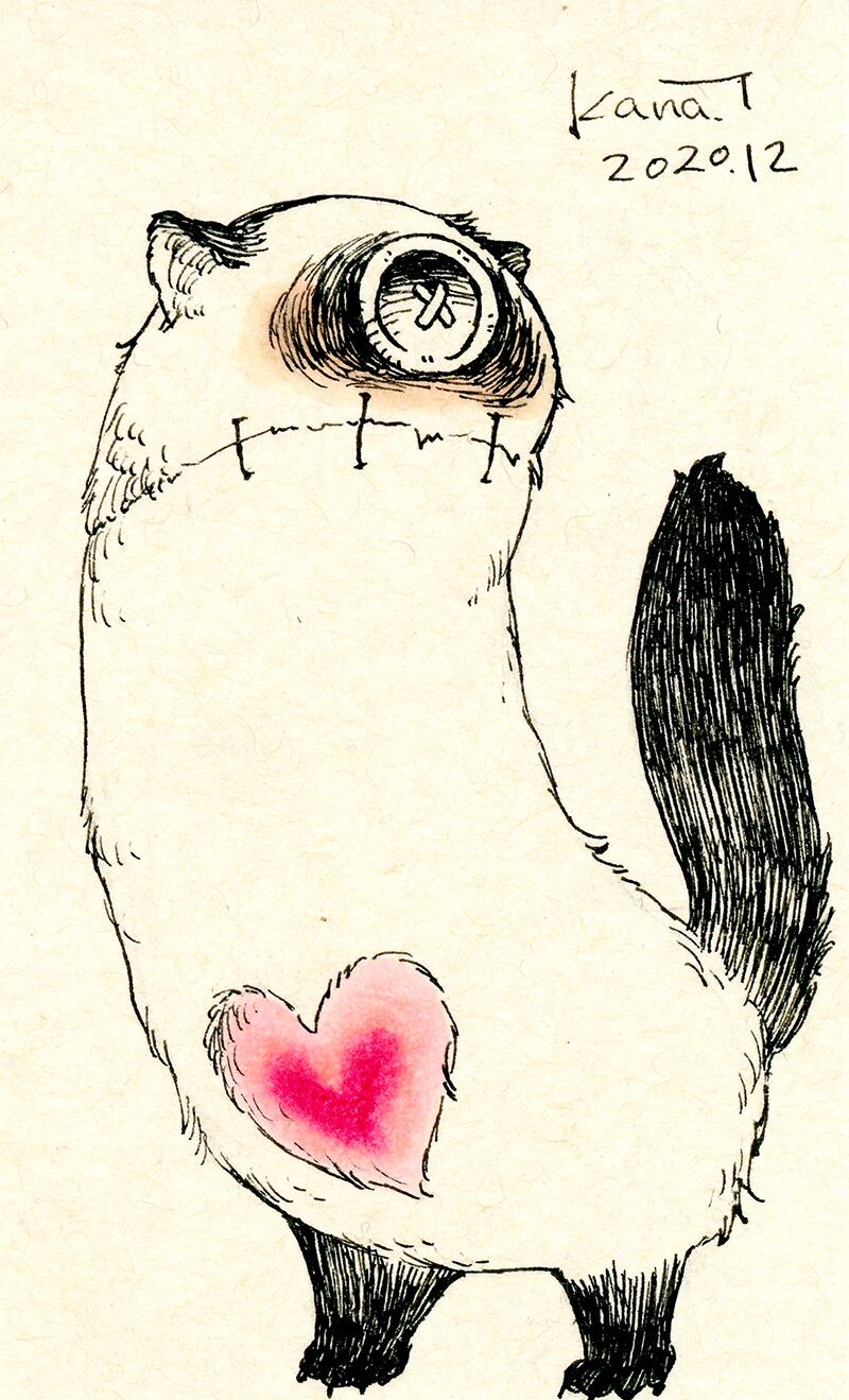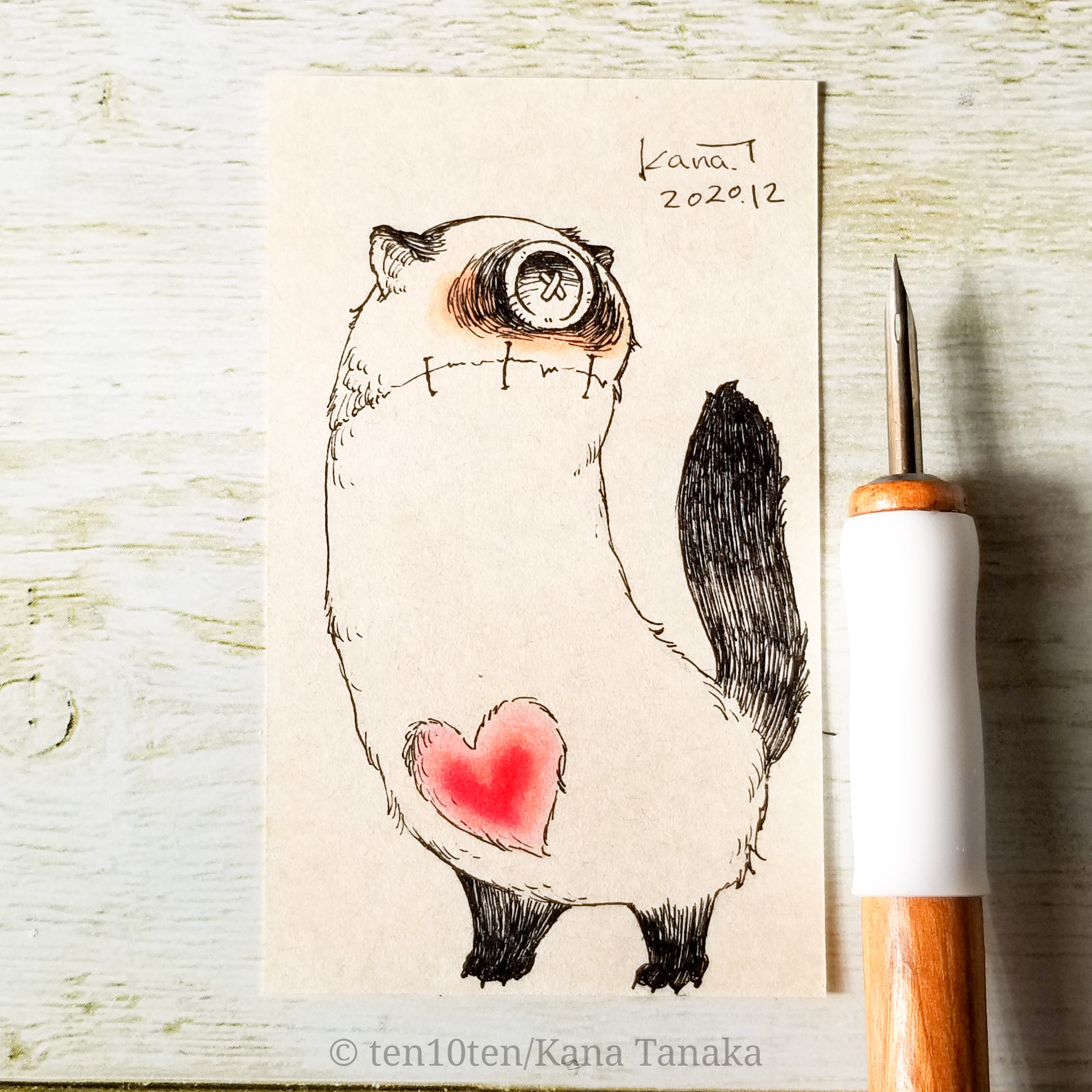 名刺サイズのドローイング作品です。 オリジナルキャラクターのぬいぐる'sには様々な生き物がいます。 今回は一つ目イタチ。 一つ目仲間のにゃんと一緒にねずみを追いかけるのが好き。 丸まって眠る姿が可愛い。 サイズ:55mm×91mm ケース:硬質塩化ビニル樹脂 ※送料込みの商品です。普通郵便にてお届けします。