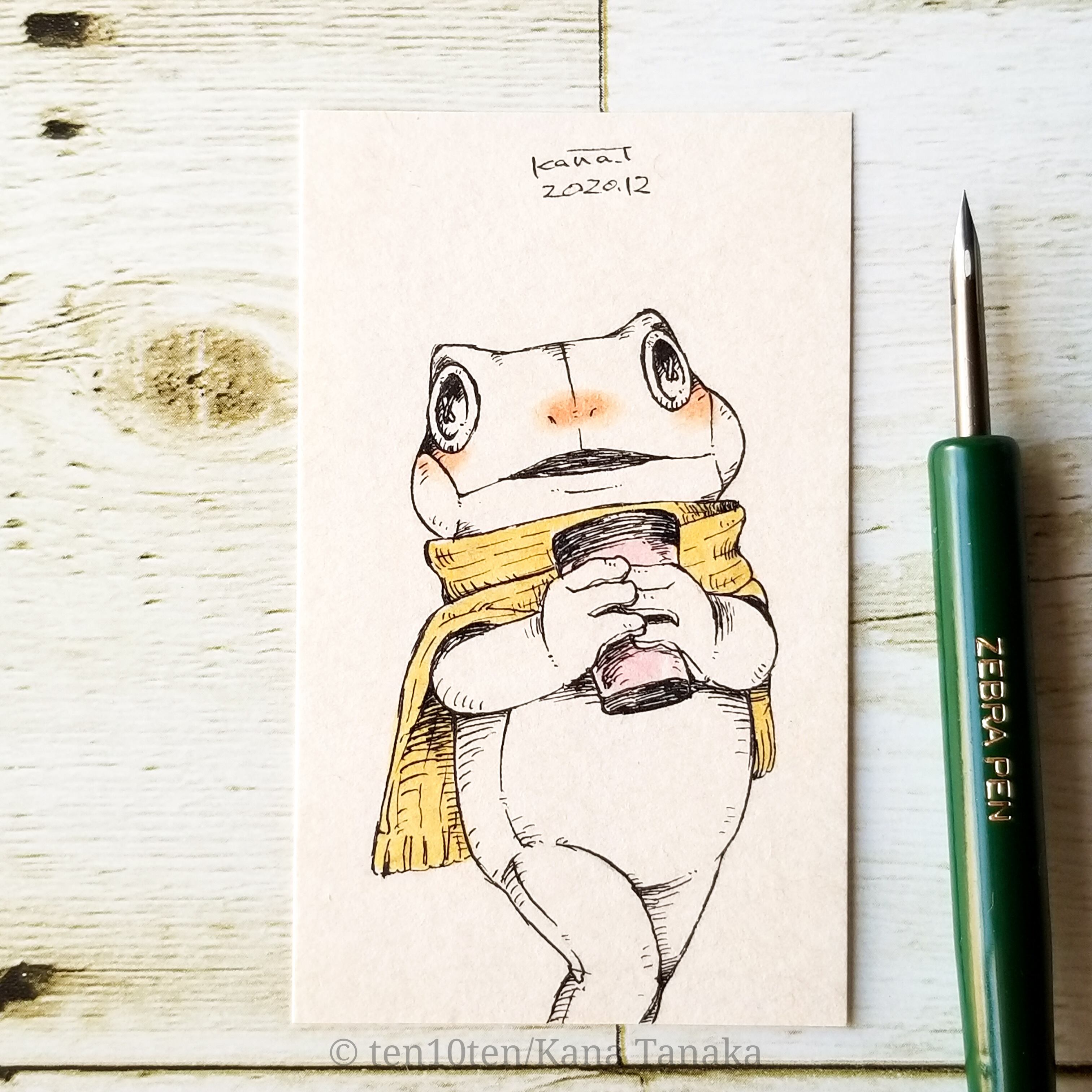 名刺サイズのドローイング作品です。 オリジナルキャラクターのぬいぐる'sには様々な生き物がいます。 今回はけろリーマンの同僚のカエルの子。 クリスマス前に二人に何かが始まるかも? サイズ:55mm×91mm ケース:硬質塩化ビニル樹脂 ※送料込みの商品です。普通郵便にてお届けします。