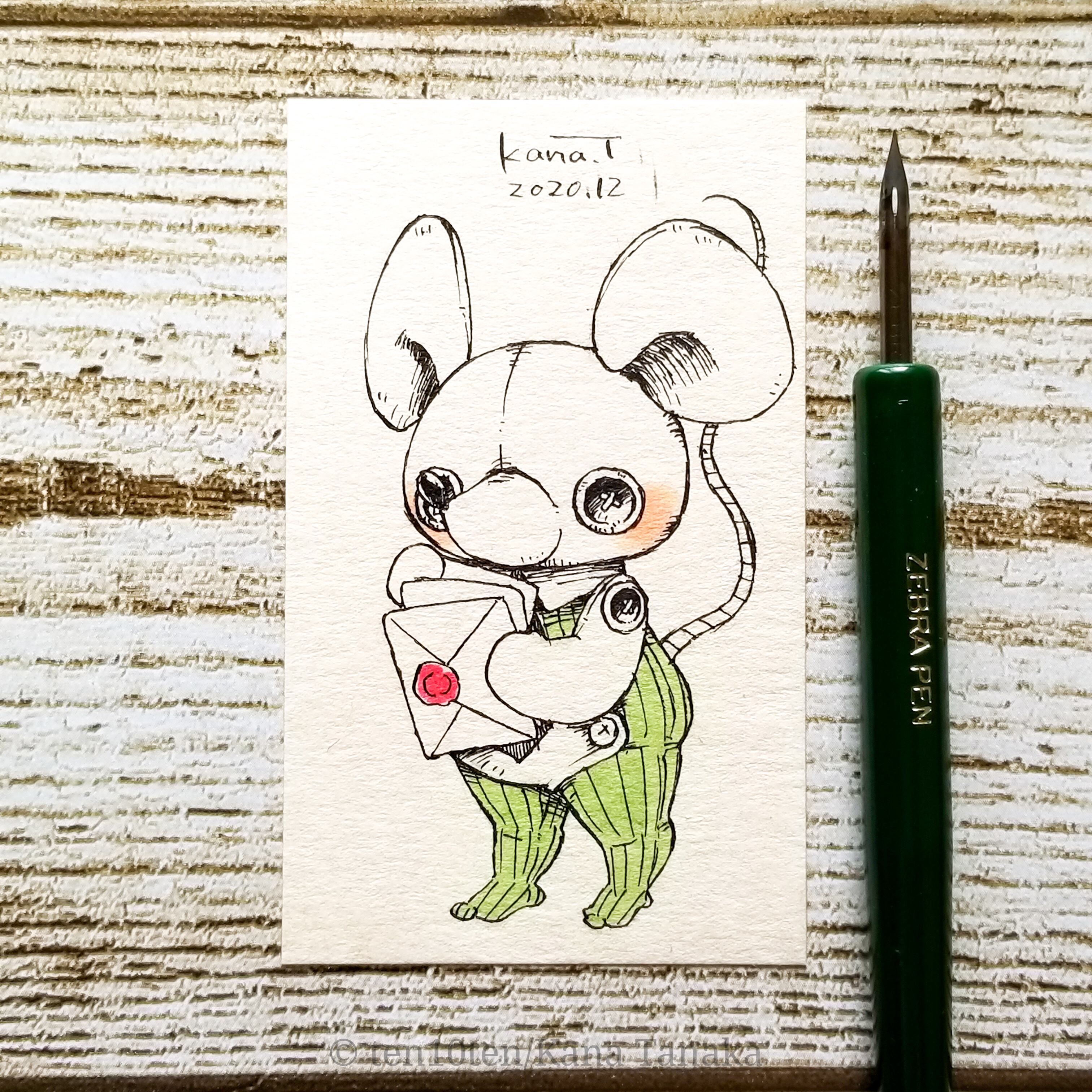 名刺サイズのドローイング作品です。 オリジナルキャラクターのぬいぐる'sには様々な生き物がいます。 今回はねずみの子。 郵便屋さんは大忙し。 最後の配達も念入りにチェック。 サイズ:55mm×91mm ケース:硬質塩化ビニル樹脂 ※送料込みの商品です。普通郵便にてお届けします。 ※ドローイングの発送は毎週月曜日にまとめて行います。