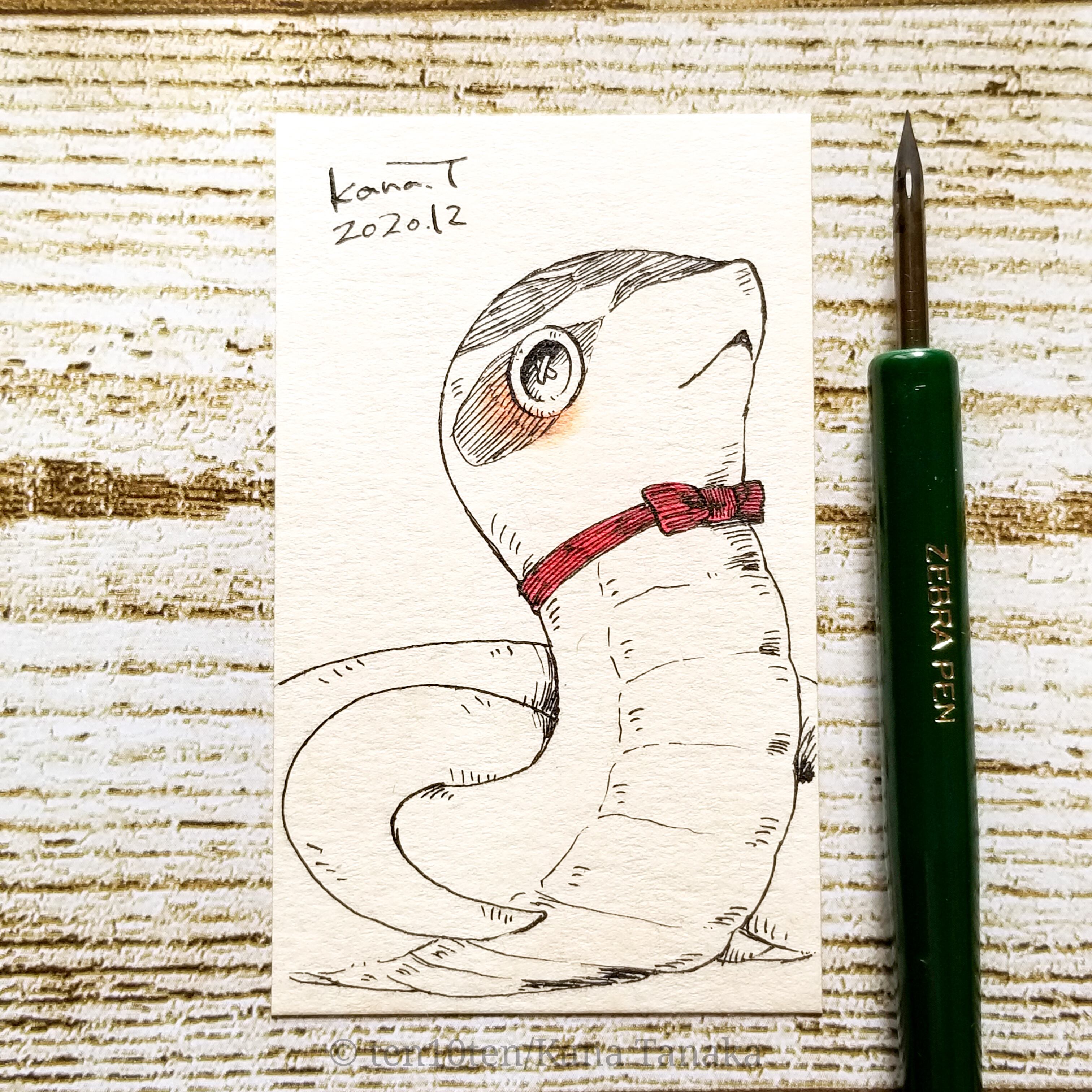 名刺サイズのドローイング作品です。 オリジナルキャラクターのぬいぐる'sには様々な生き物がいます。 今回はセイブシシバナヘビの子。 お洒落さんで、リボン屋と帽子屋の常連さん。 サイズ:55mm×91mm ケース:硬質塩化ビニル樹脂 ※送料込みの商品です。普通郵便にてお届けします。 ※ドローイングの発送は毎週月曜日にまとめて行います。