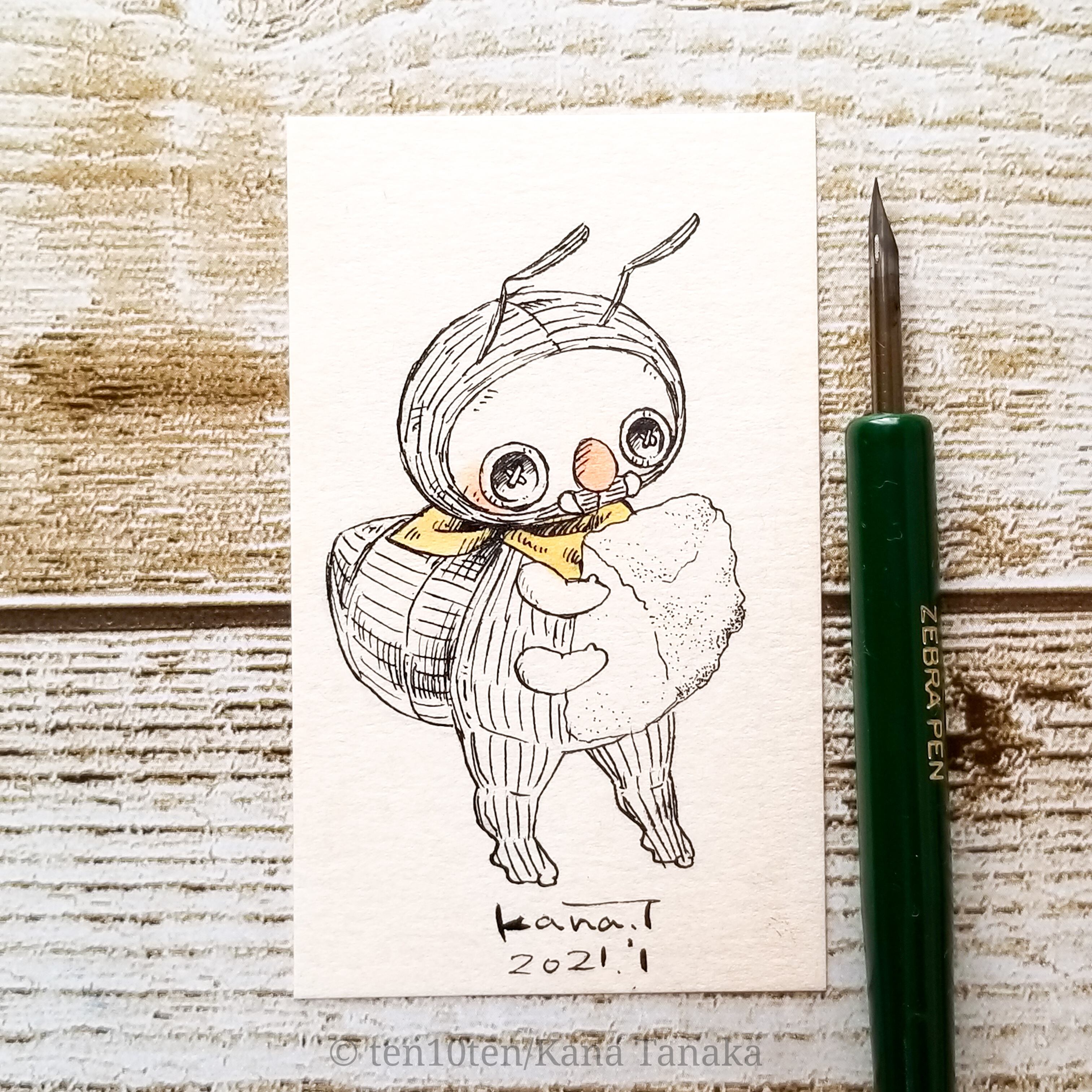 名刺サイズのドローイング作品です。 オリジナルキャラクターのぬいぐる'sには様々な生き物がいます。 今回はアリの子。 角砂糖の欠片はご馳走。 サイズ:55mm×91mm ケース:硬質塩化ビニル樹脂 ※送料込みの商品です。普通郵便にてお届けします。 ※ドローイングの発送は毎週月曜日にまとめて行います。