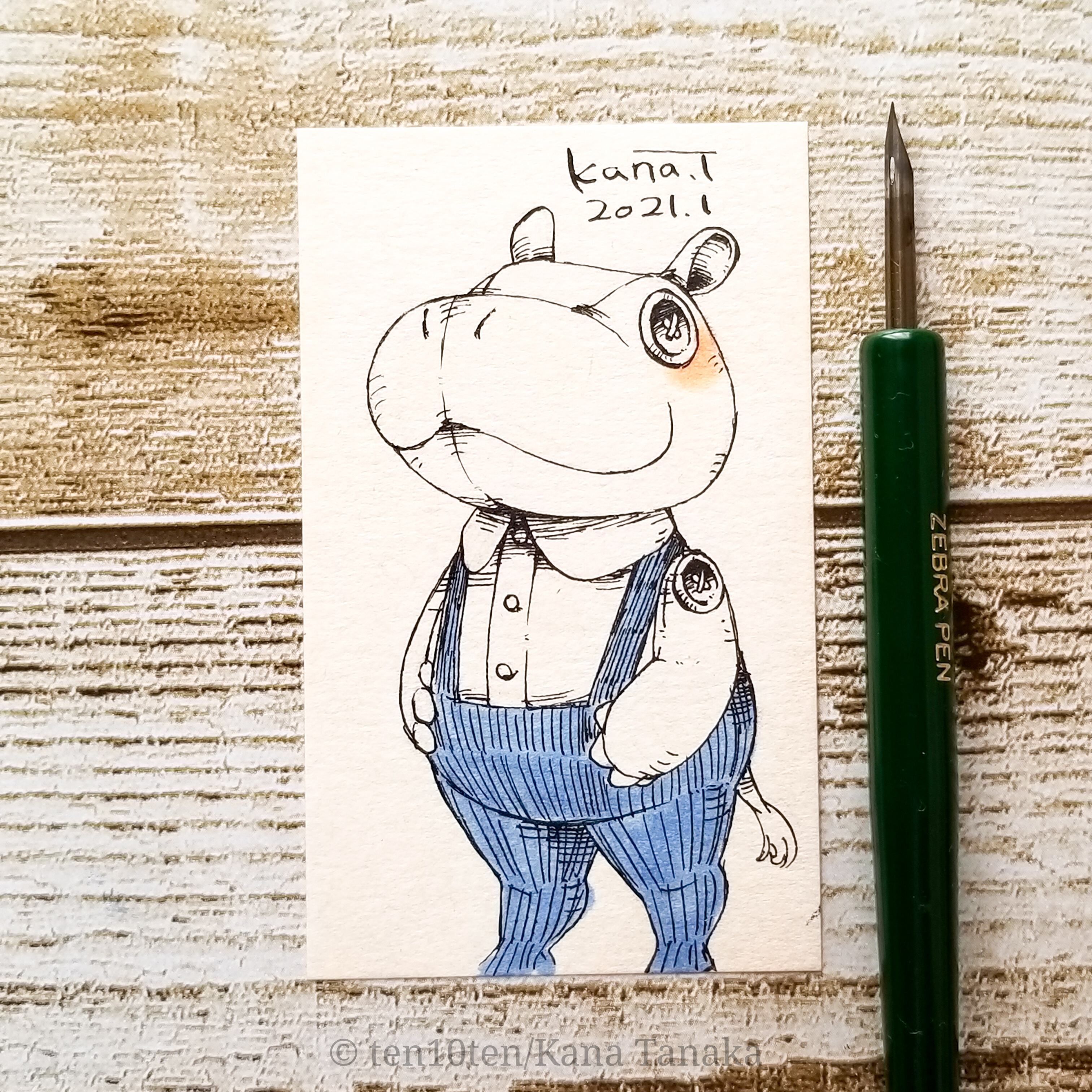 名刺サイズのドローイング作品です。 オリジナルキャラクターのぬいぐる'sには様々な生き物がいます。 今回はカバの子。 今日のおやつは何かなぁ。 サイズ:55mm×91mm ケース:硬質塩化ビニル樹脂 ※送料込みの商品です。普通郵便にてお届けします。 ※ドローイングの発送は毎週月曜日にまとめて行います。