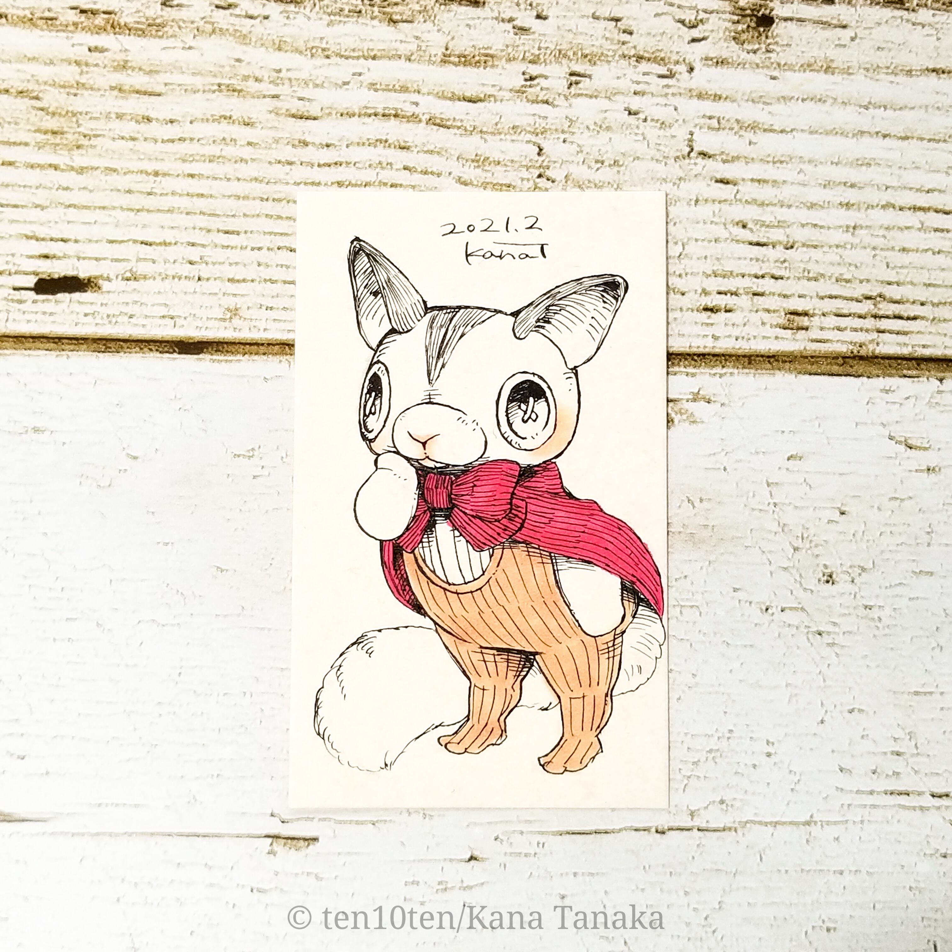 名刺サイズのドローイング作品です。 オリジナルキャラクターのぬいぐる'sには、色々な生き物がいます。 今回はモモンガの子。 お気に入りのマントで飛ぶ練習中。 サイズ:55mm×91mm ケース:硬質塩化ビニル樹脂 ※送料込みの商品です。普通郵便にてお届けします。 ※ドローイングの発送は毎週月曜日にまとめて行います。