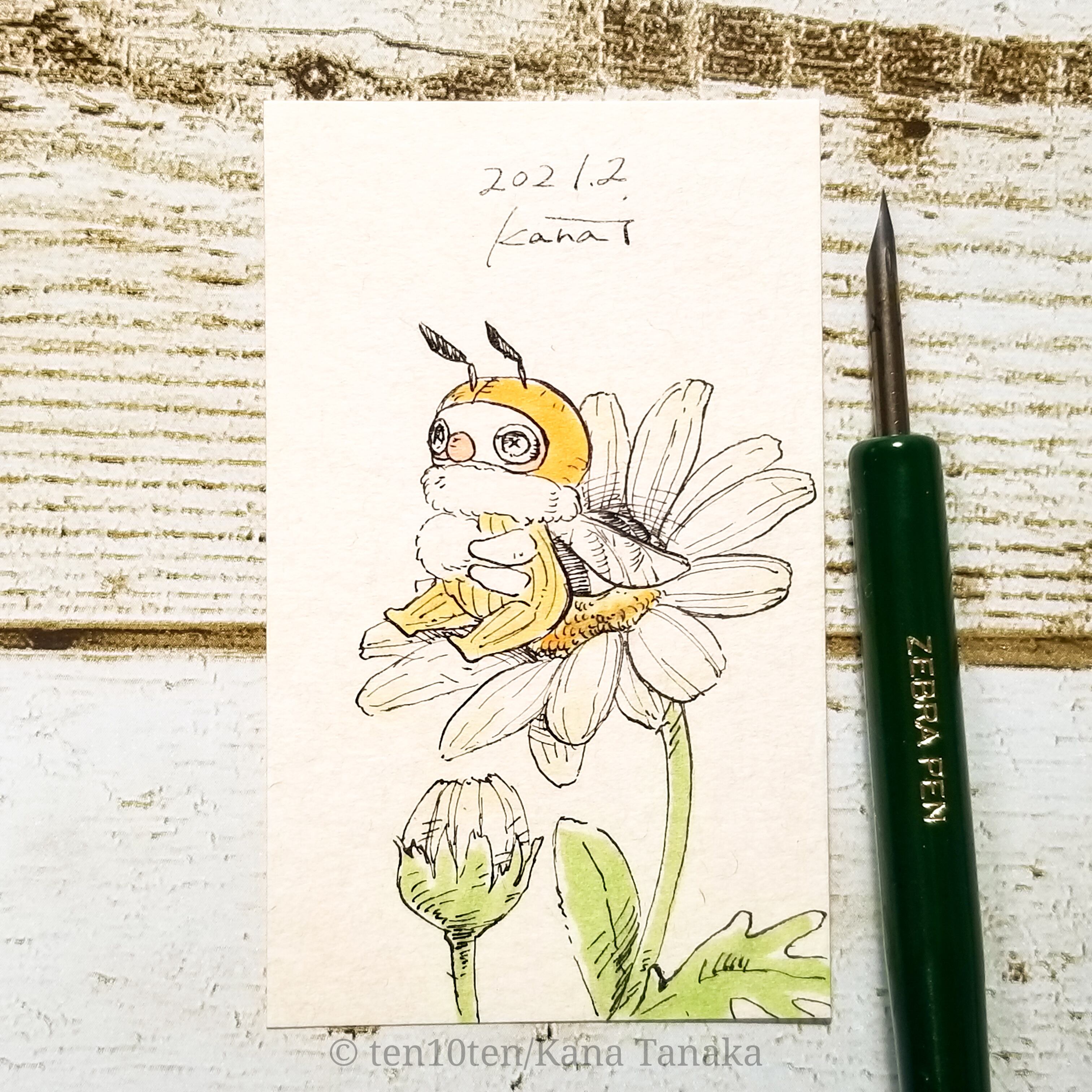 名刺サイズのドローイング作品です。 オリジナルキャラクターのぬいぐる'sには、色々な生き物がいます。 今回はミツバチの子。 お団子を持ってピクニック。 サイズ:55mm×91mm ケース:硬質塩化ビニル樹脂 ※送料込みの商品です。普通郵便にてお届けします。 ※ドローイングの発送は毎週月曜日にまとめて行います。