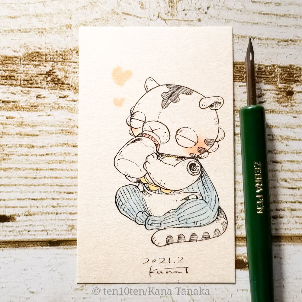 名刺サイズのドローイング作品です。 オリジナルキャラクターのぬいぐる'sには色々な生き物がいます。 今回はトラの子。 この時間が一番。 サイズ:55mm×91mm ケース:硬質塩化ビニル樹脂 ※送料込みの商品です。普通郵便にてお届けします。 ※ドローイングの発送は毎週月曜日にまとめて行います。