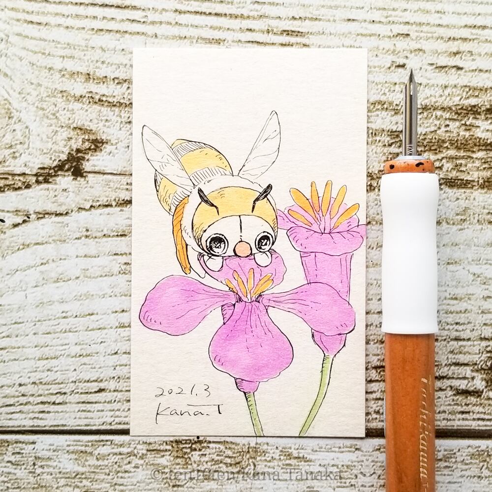名刺サイズのドローイング作品です。 オリジナルキャラクターのぬいぐる'sには、色々な生き物がいます。 今回はミツバチの子。 かわいいお花。 サイズ:55mm×91mm ケース:硬質塩化ビニル樹脂 ※送料込みの商品です。普通郵便にてお届けします。 ※ドローイングの発送は毎週月曜日にまとめて行います。