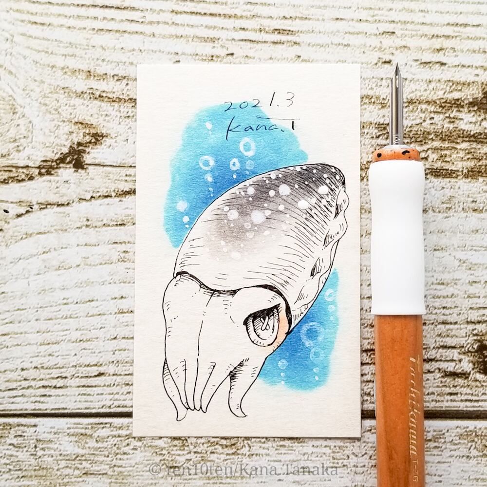 名刺サイズのドローイング作品です。 オリジナルキャラクターのぬいぐる'sには、色々な生き物がいます。 今回はコウイカの子。 かわいいけれどキリッと格好良くなりたい。 サイズ:55mm×91mm ケース:硬質塩化ビニル樹脂 ※送料込みの商品です。普通郵便にてお届けします。 ※ドローイングの発送は毎週月曜日にまとめて行います。