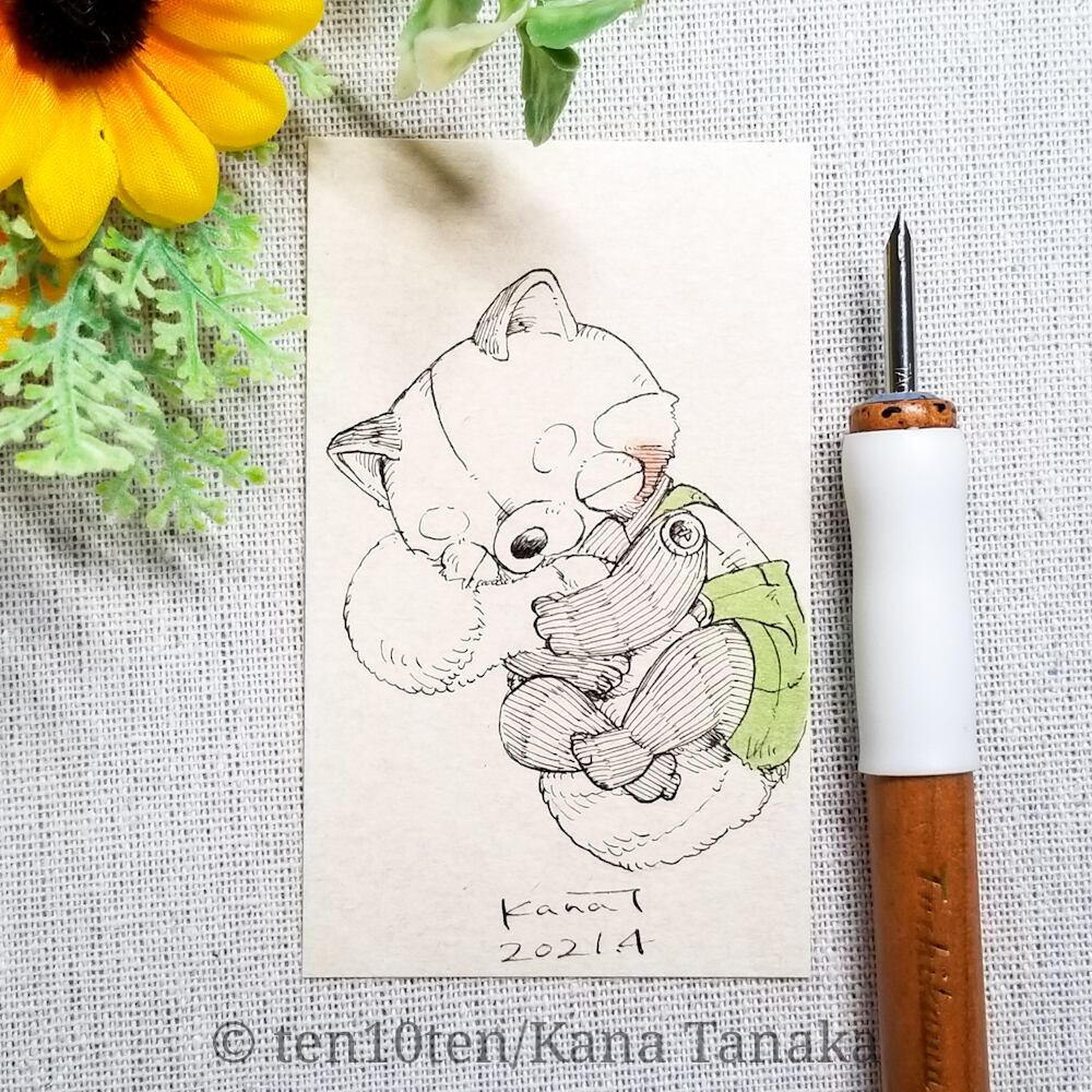 名刺サイズのドローイング作品です。 オリジナルキャラクターのぬいぐる'sには、色々な生き物がいます。 今回はレッサーパンダの子。 もふもふの尻尾と、ふわふわの夢。 サイズ:55mm×91mm ケース:硬質塩化ビニル樹脂 ※送料込みの商品です。普通郵便にてお届けします。 ※ドローイングの発送は毎週月曜日にまとめて行います。