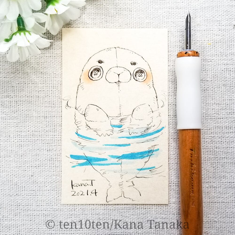 名刺サイズのドローイング作品です。 オリジナルキャラクターのぬいぐる'sには、色々な生き物がいます。 今回はアザラシの子。 初めての入水で緊張の面持ち。 サイズ:55mm×91mm ケース:硬質塩化ビニル樹脂 ※送料込みの商品です。普通郵便にてお届けします。 ※ドローイングの発送は毎週月曜日にまとめて行います。