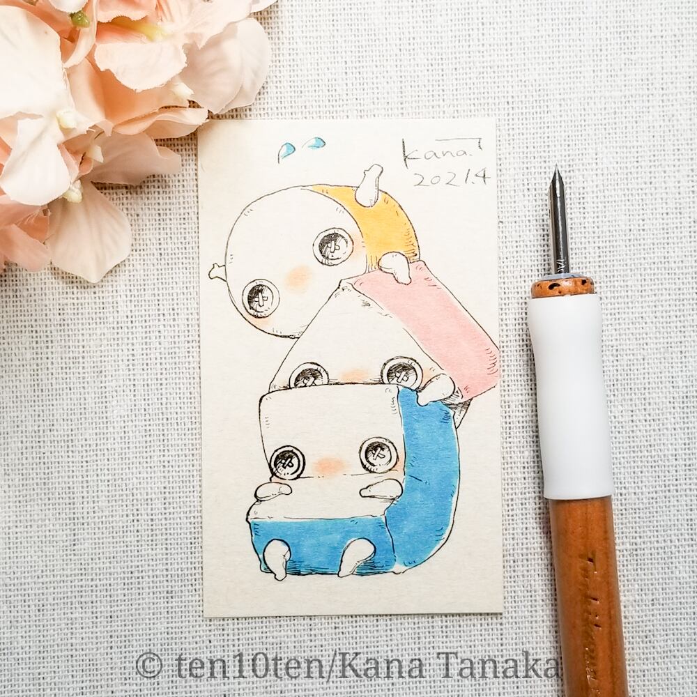 名刺サイズのドローイング作品です。 オリジナルキャラクターのぬいぐる'sには、色々な生き物がいます。 今回はつみきの子。 いつも3人一緒で仲良し。 丸の子は直ぐに一番上にいきたがる。 サイズ:55mm×91mm ケース:硬質塩化ビニル樹脂 ※送料込みの商品です。普通郵便にてお届けします。 ※ドローイングの発送は毎週月曜日にまとめて行います。