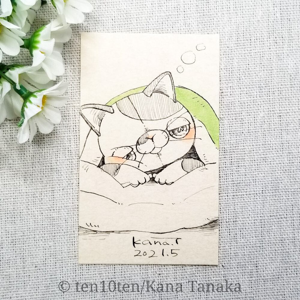 名刺サイズのドローイング作品です。 オリジナルキャラクターのぬいぐる'sには、色々な生き物がいます。 今回はねこの子。 春眠暁を覚えられない サイズ:55mm×91mm ケース:硬質塩化ビニル樹脂 ※送料込みの商品です。普通郵便にてお届けします。 ※ドローイングの発送は毎週月曜日にまとめて行います。