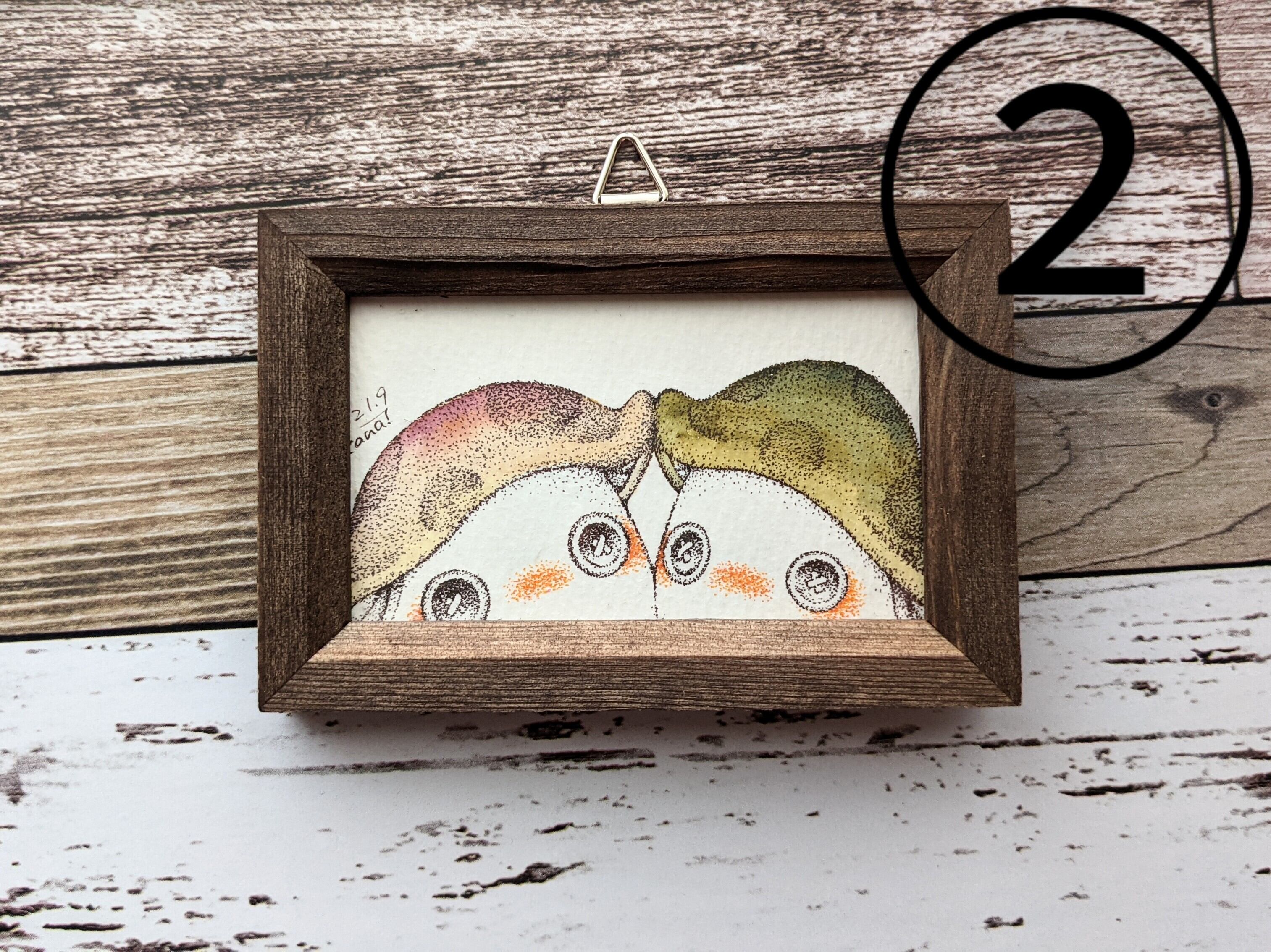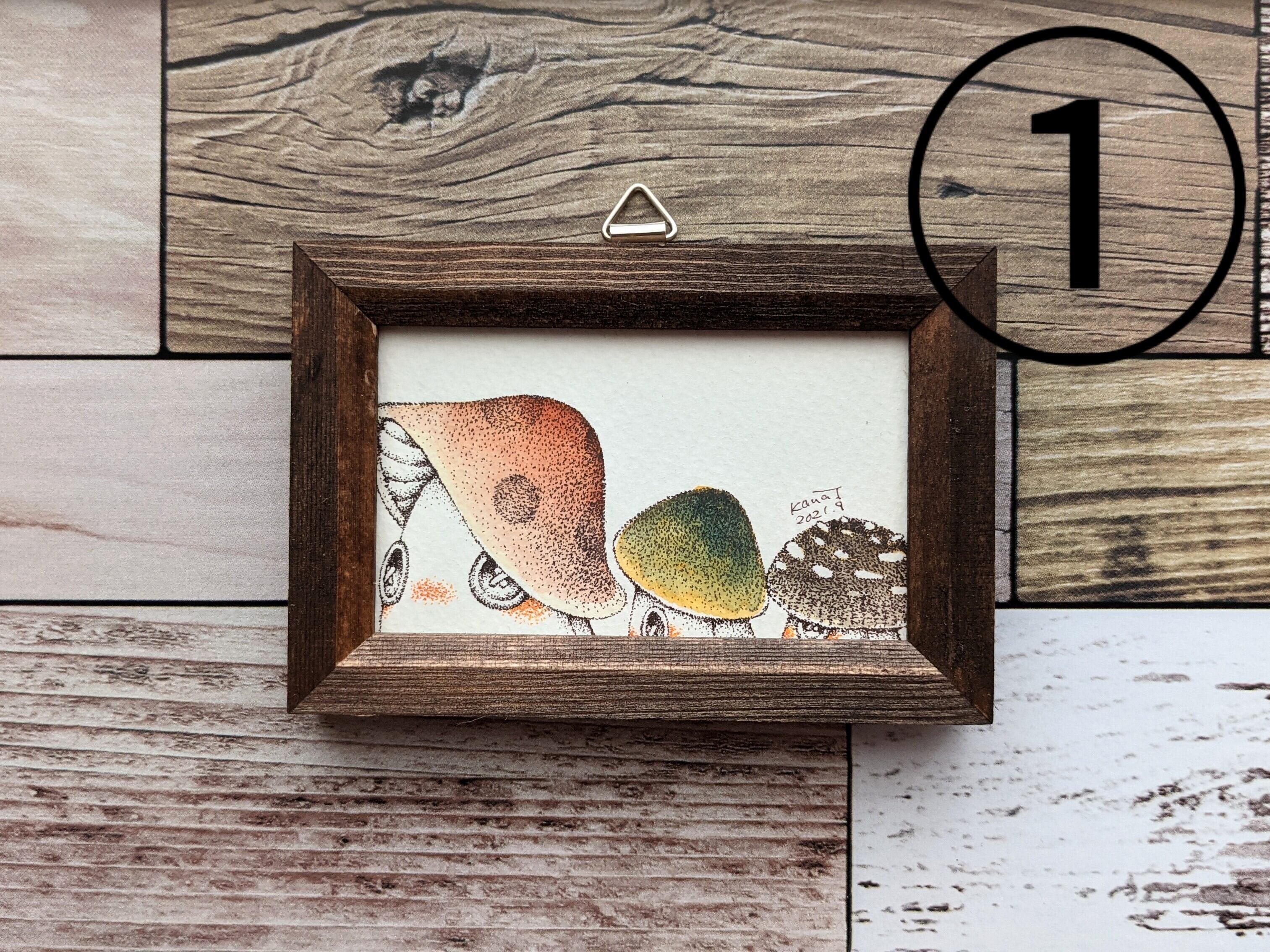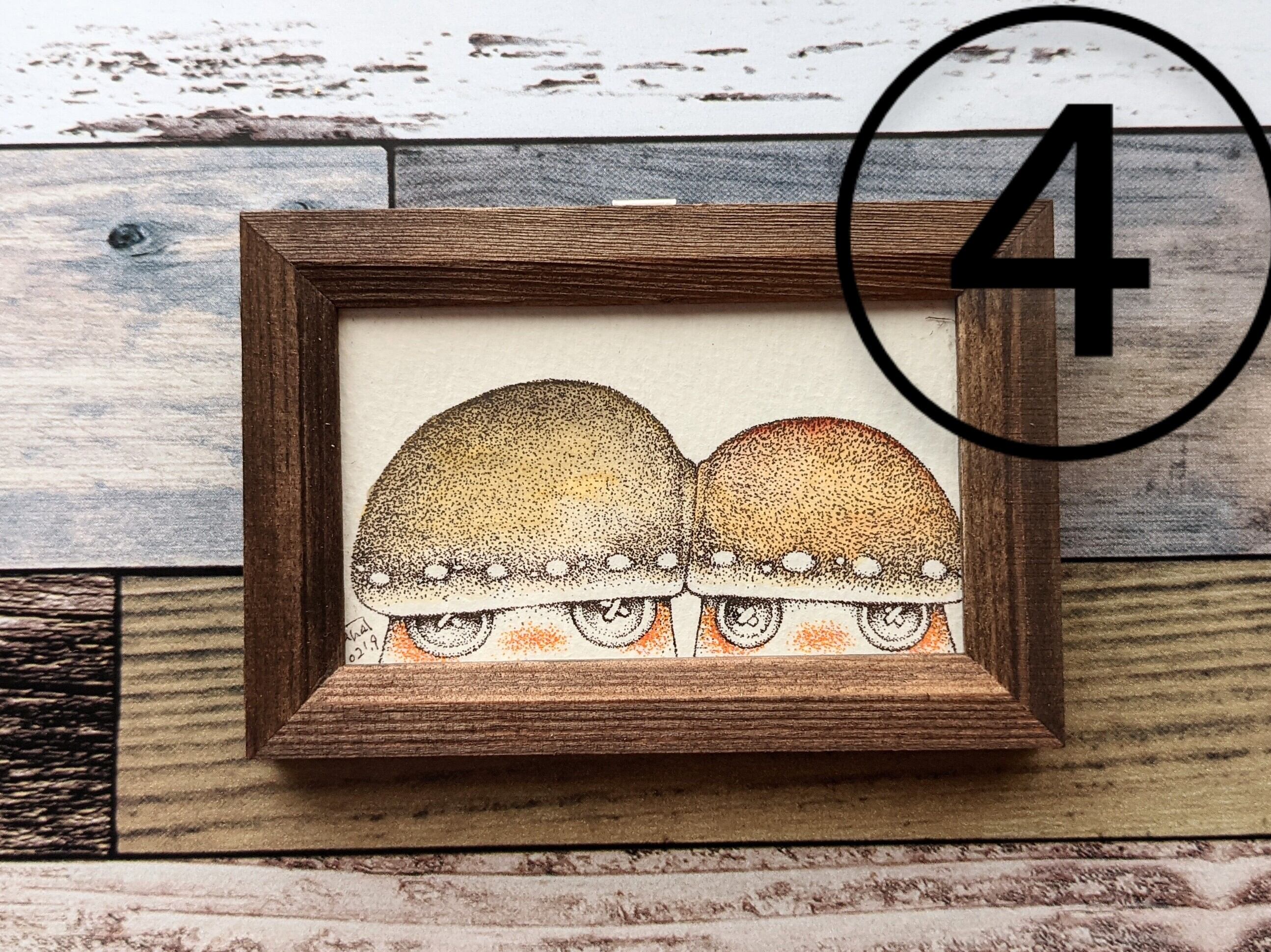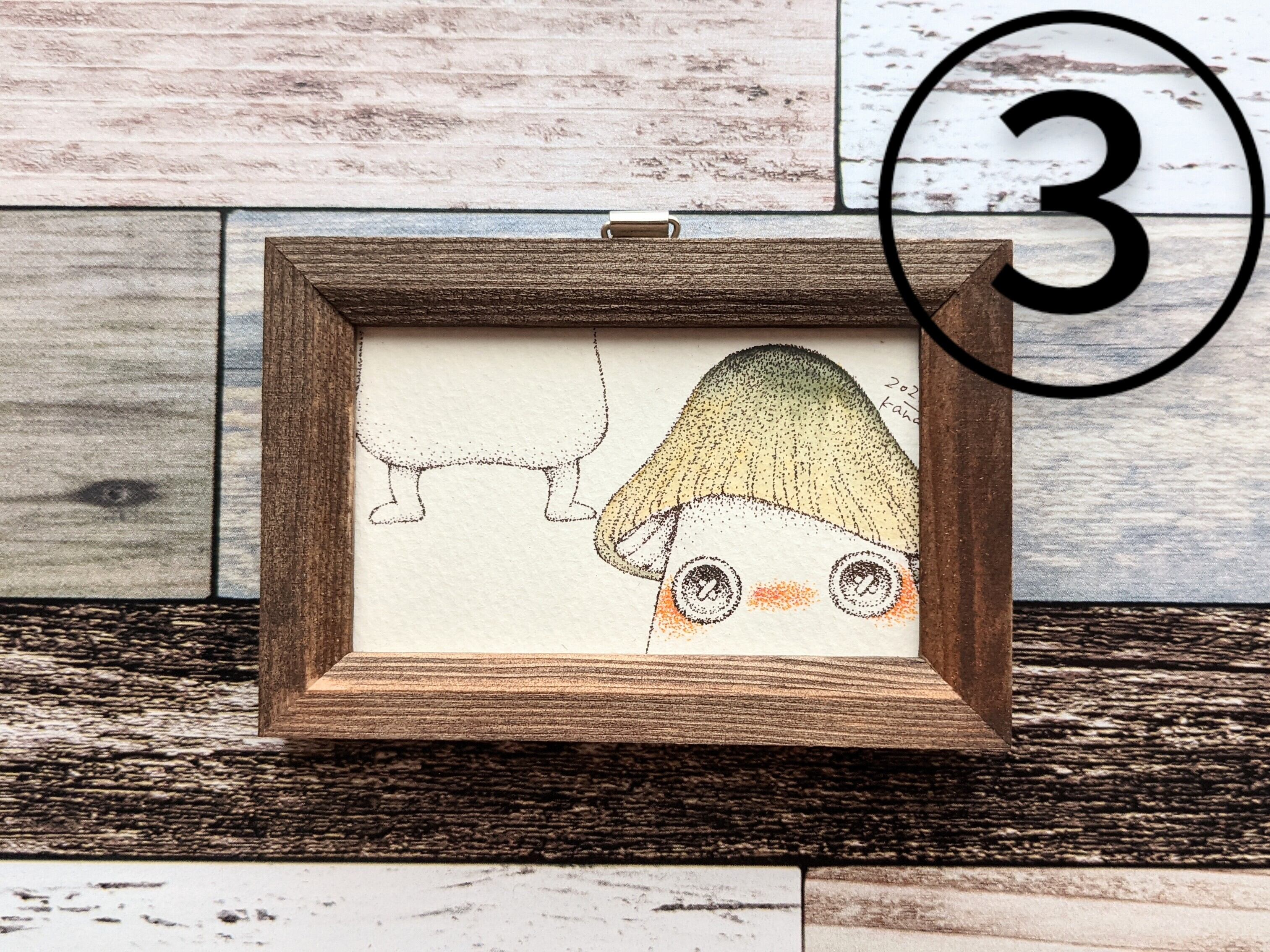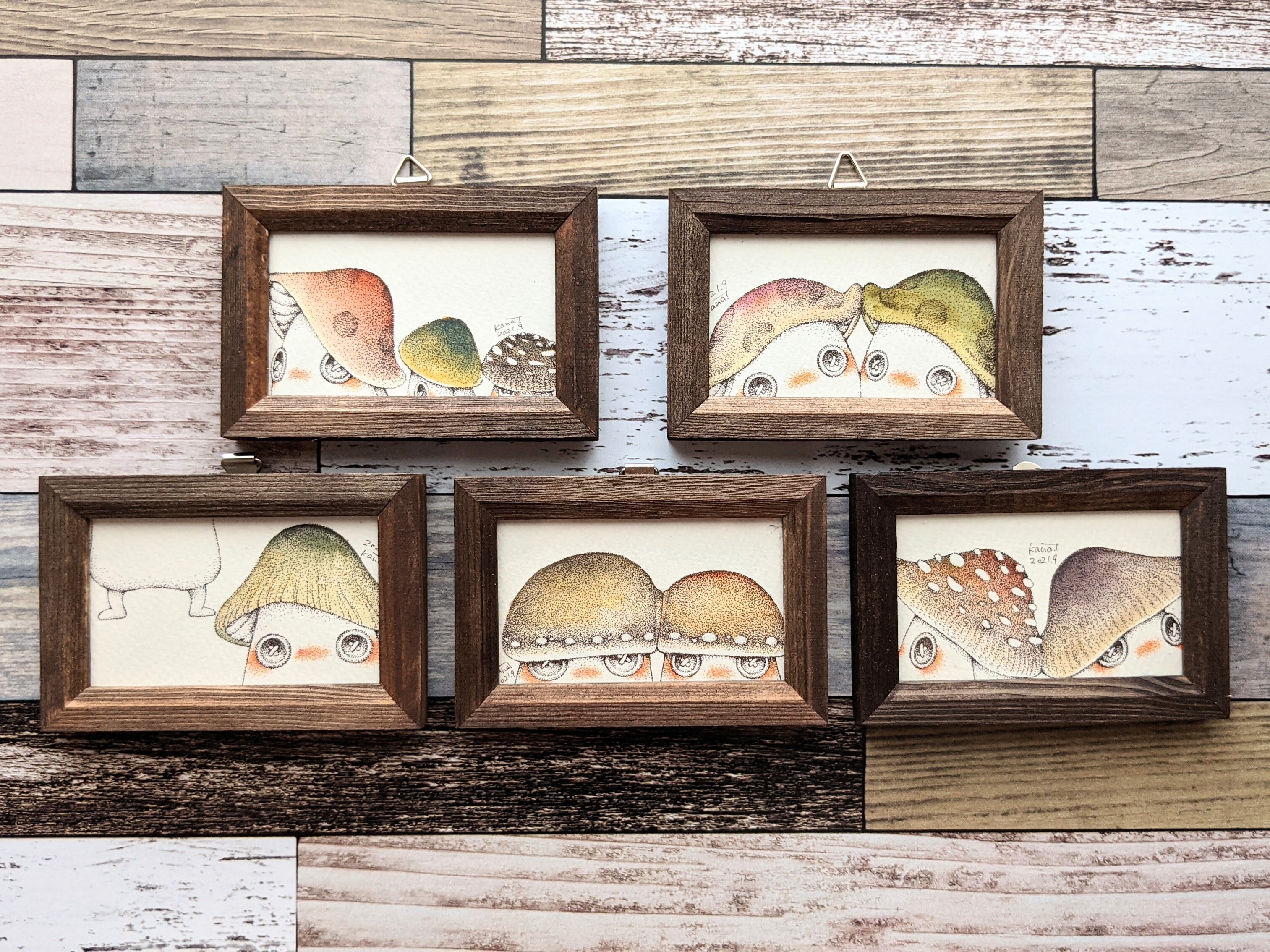 しっとりとした空気とともに現れる可愛いきのこたち。 誰かと一緒にいるのが好きで、いつも何かにくっついている。 サイズ:10.7cm×7.7cm(額込み) ※写真と実際の商品とでは、閲覧いただく媒体などにより色味に若干の違いがございますので、予めご了承ください。