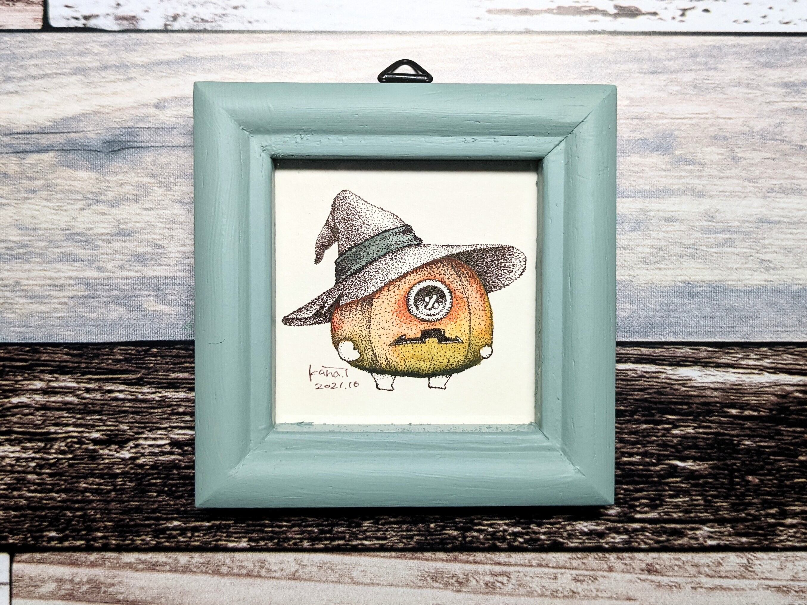 魔法使いに憧れる1つ目カボチャのぼっちゃん。 立派な魔法使いになれるかしら。 サイズ:作品5.5cm×5.5cm 額:7.7cm×7.7cm ※写真と実際の商品とでは、閲覧いただく媒体などにより色味に若干の違いがございますので、予めご了承ください。