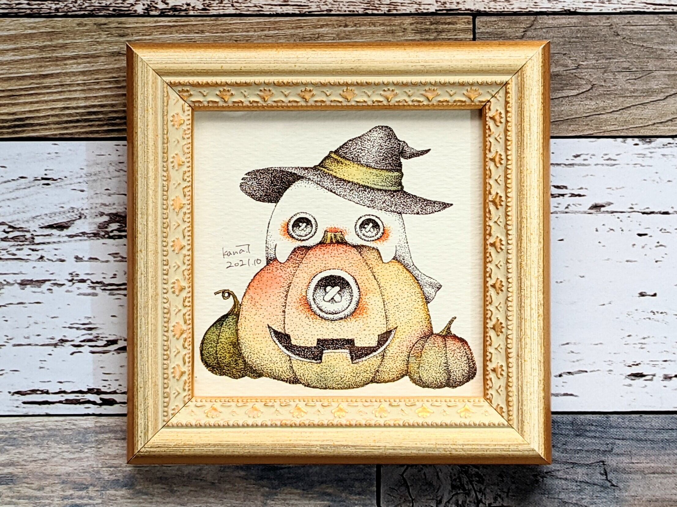 ハロウィンの友達。 大カボチャは移動する時には足が生える。 サイズ:約10cm×10cm(原画サイズ) ※写真と実際の商品とでは、閲覧いただく媒体などにより色味に若干の違いがございますので、予めご了承ください。