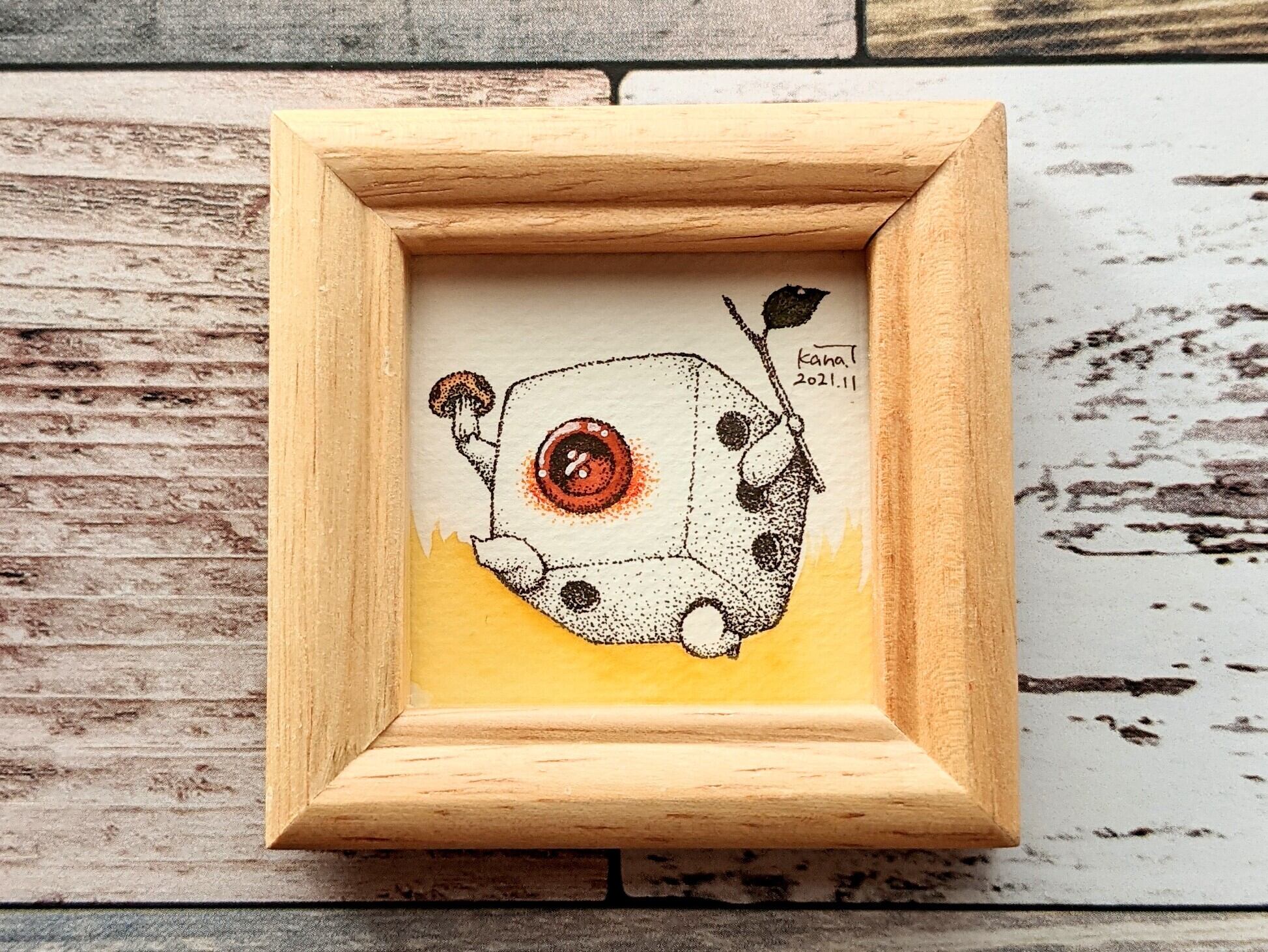 サイコロ族の中でも1番の元気っ子。 今日もお気に入りの枝を持って走り回っています。 サイズ:作品5.5cm×5.5cm 額:7.7cm×7.7cm ※写真と実際の商品とでは、閲覧いただく媒体などにより色味に若干の違いがございますので、予めご了承ください。