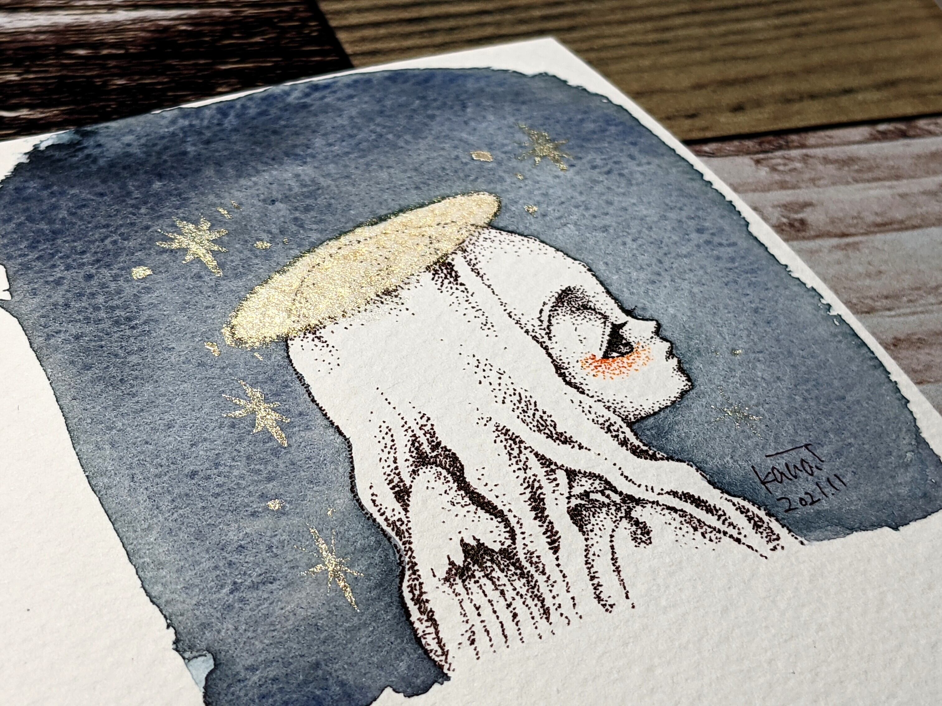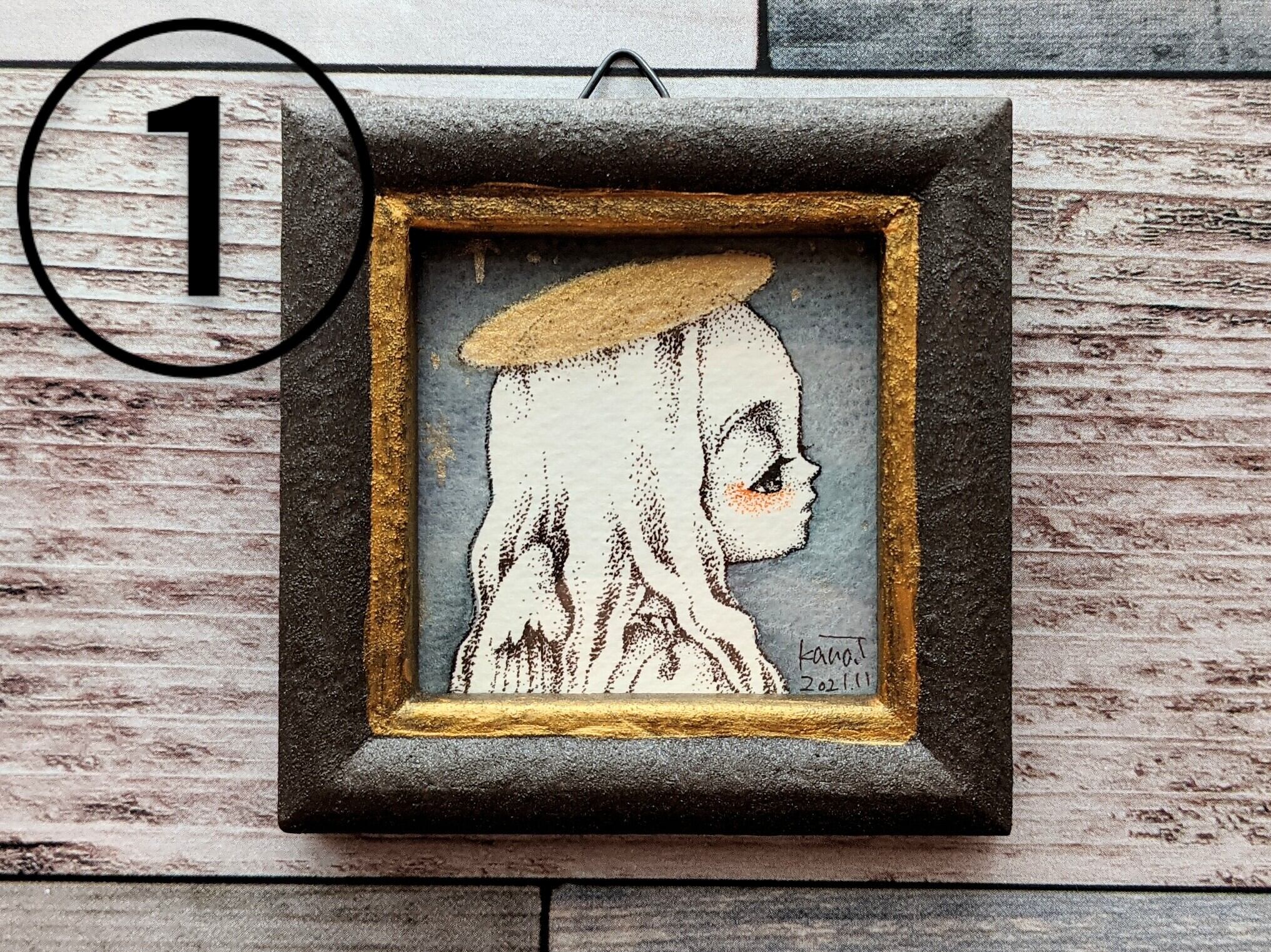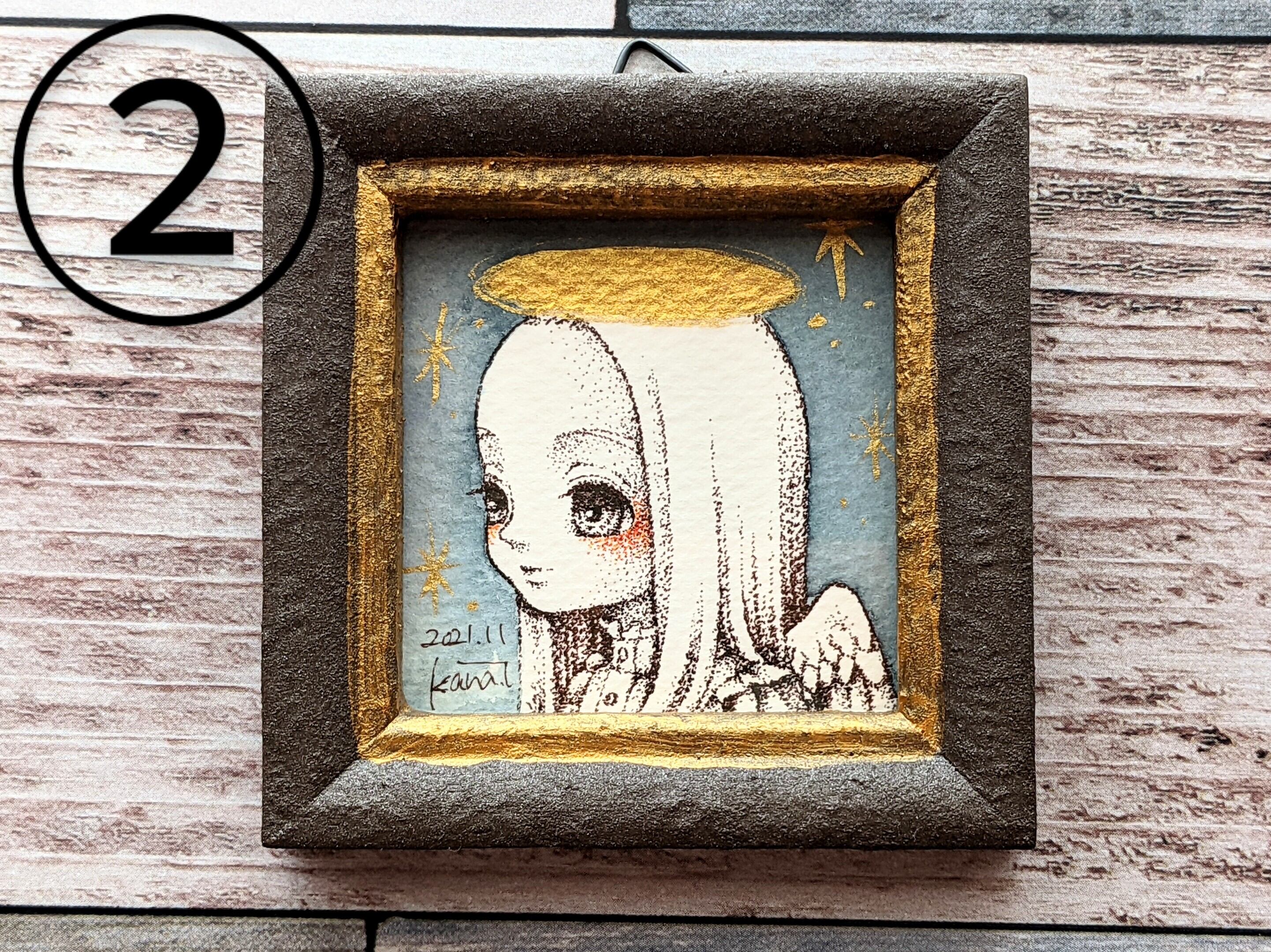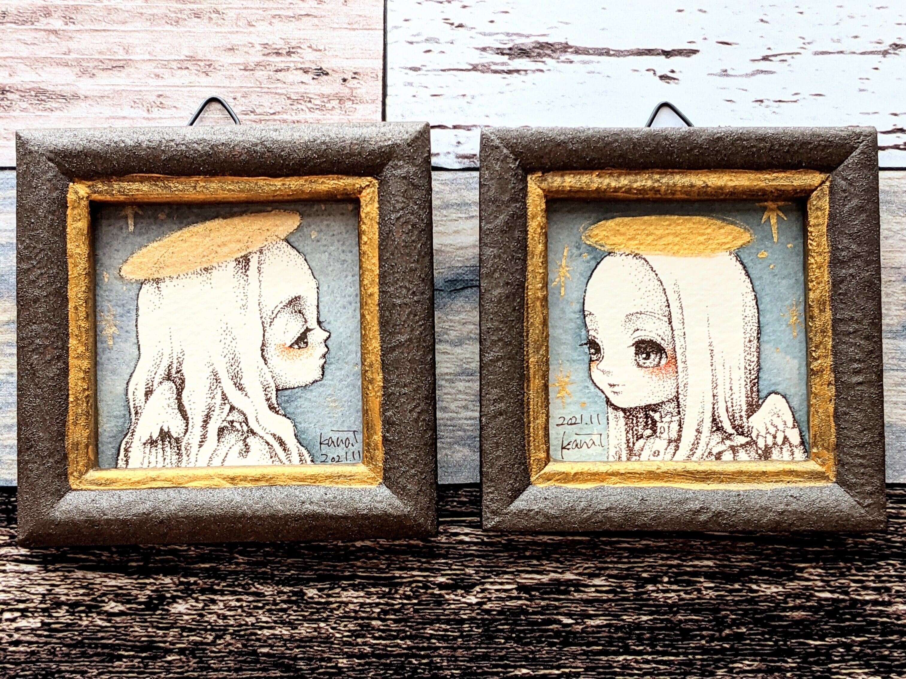 手のひらサイズの天使ちゃんたち。 天使の輪と背景の星が角度によってキラキラと輝きます。 サイズ:作品5.5cm×5.5cm 額:7.7cm×7.7cm ※写真と実際の商品とでは、閲覧いただく媒体などにより色味に若干の違いがございますので、予めご了承ください。