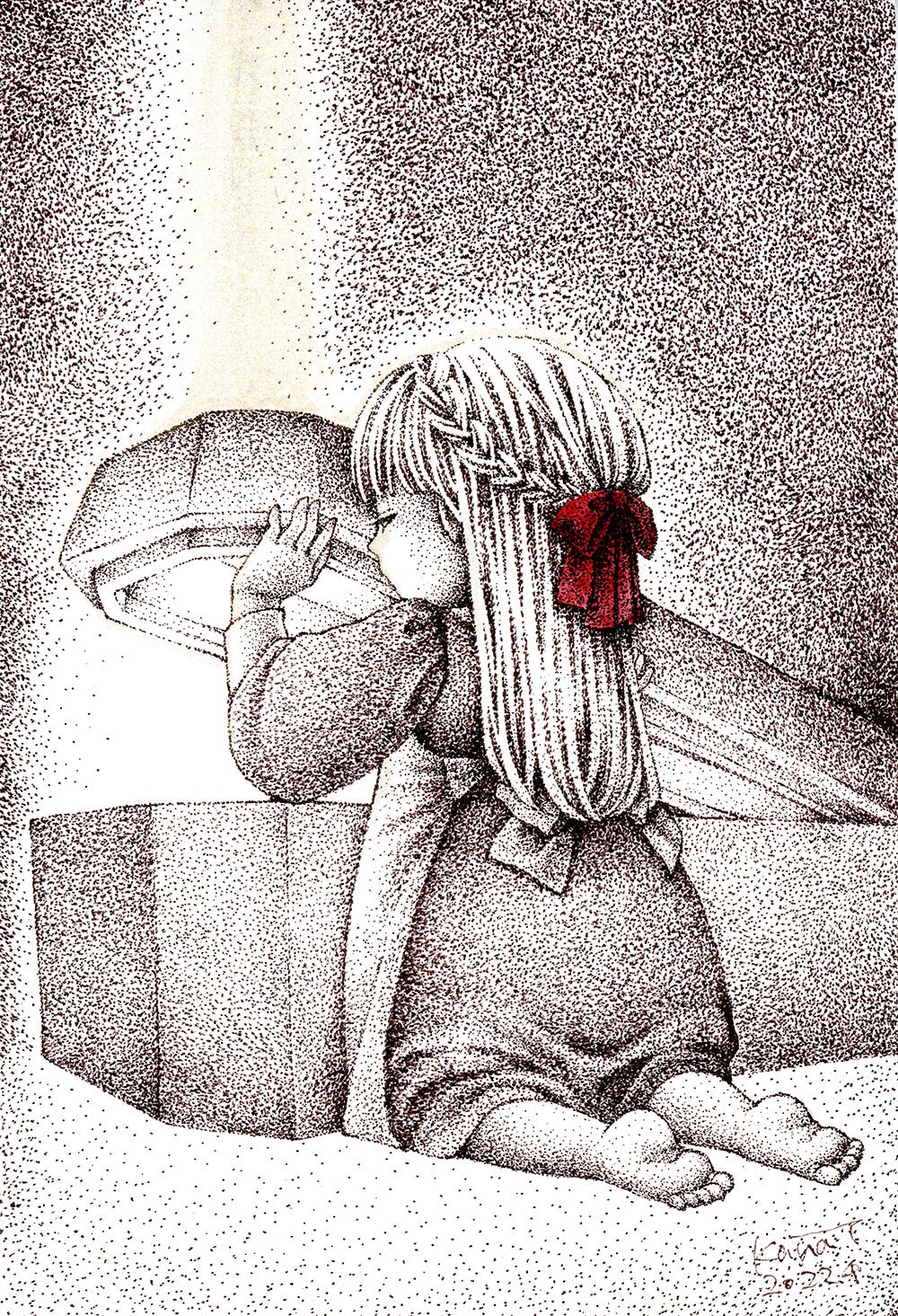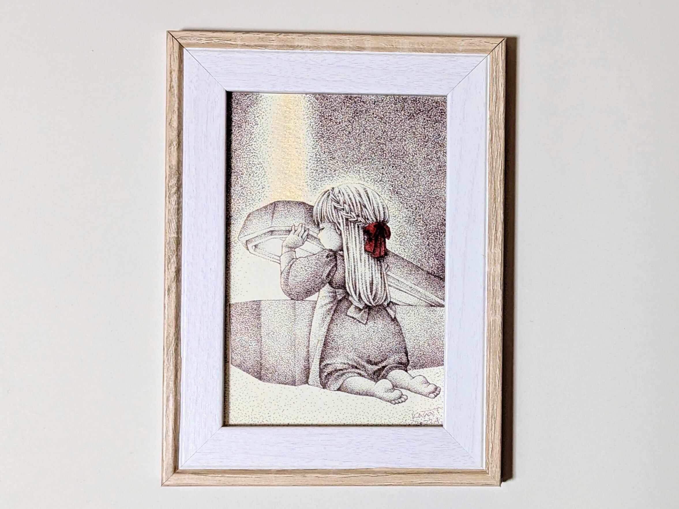 『開けてはいけないもの』をテーマにした展示会で制作した作品。 少女が明けた先に居るのは。 画材:ボールペン(シグノ)、顔彩絵具 サイズ:約10cm×14.8cm(原画サイズ) 額装:木、プラスチック ※写真と実際の商品とでは、閲覧いただく媒体などにより色味に若干の違いがございますので、予めご了承ください。