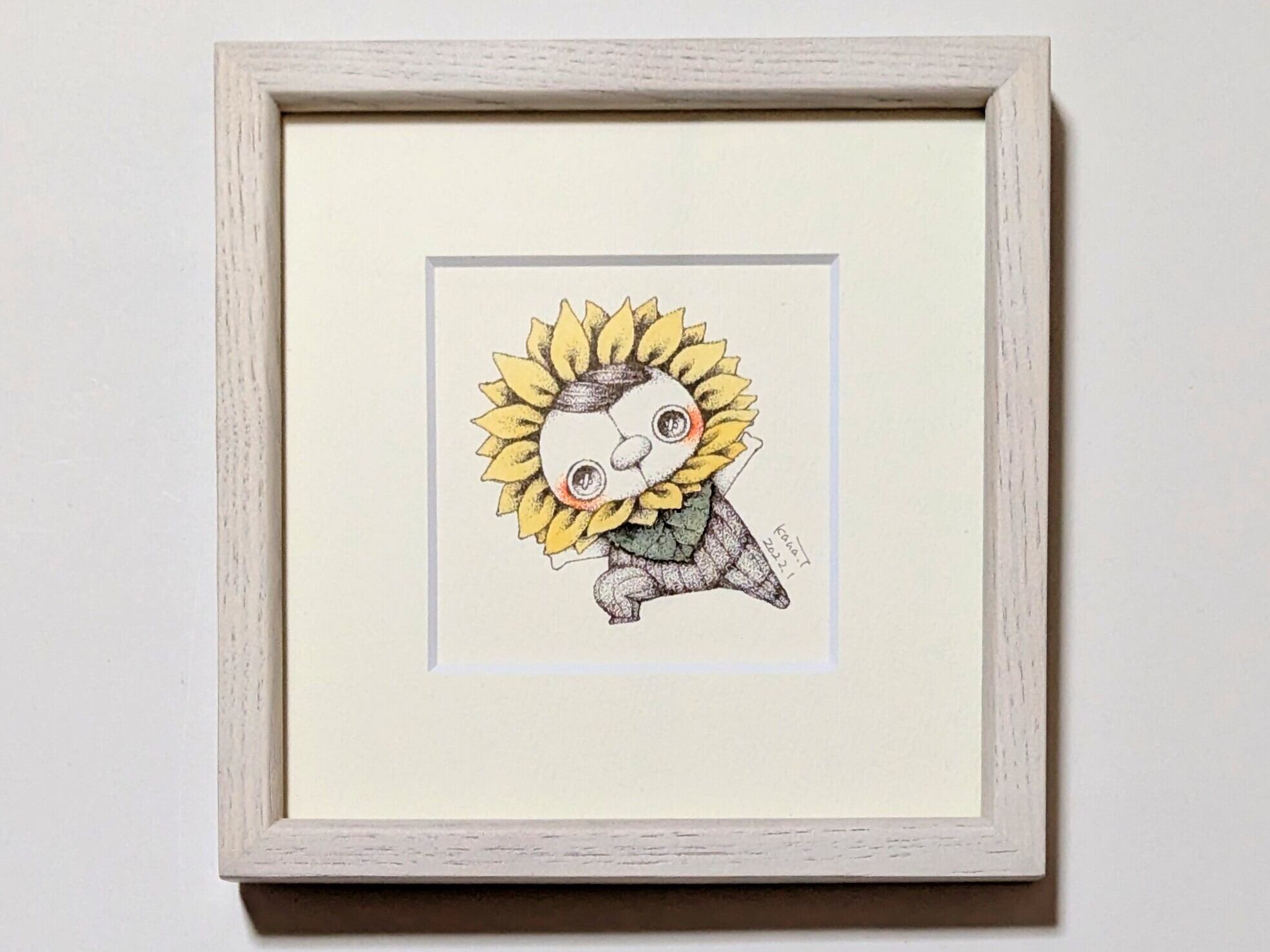 元気いっぱい 画材:ボールペン(シグノ)、水彩紙、顔彩絵の具 サイズ:約16.7cm×16.7cm(額装込み) 額装:木、アクリル [取り扱いについて] 飾る際には直射日光を避けていただき、保管する際には高温多湿を避けて暗所に保管をお願いします。 特に、直射日光が当たると退色が早く、長く作品を楽しめなくなる可能性がございます。
