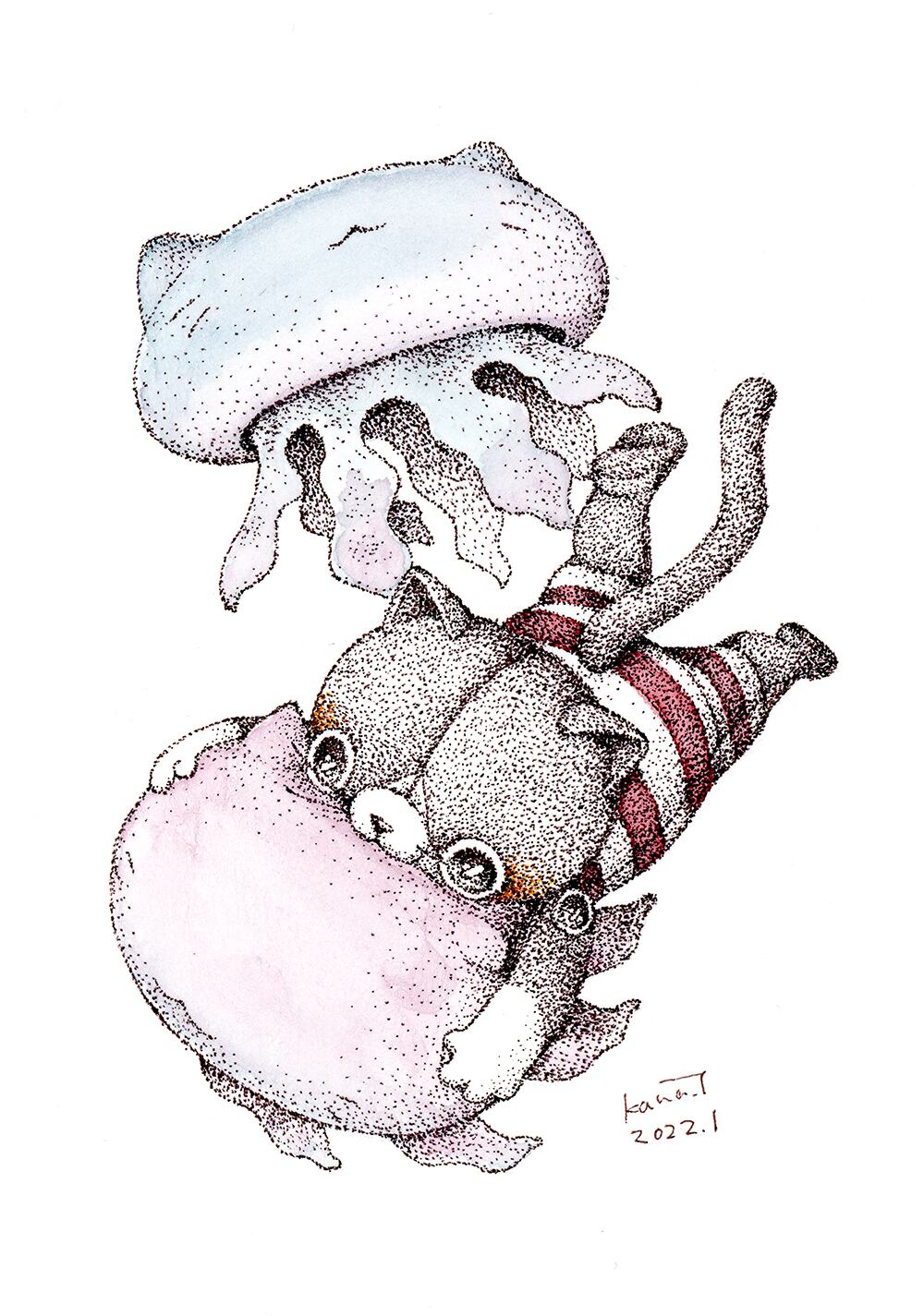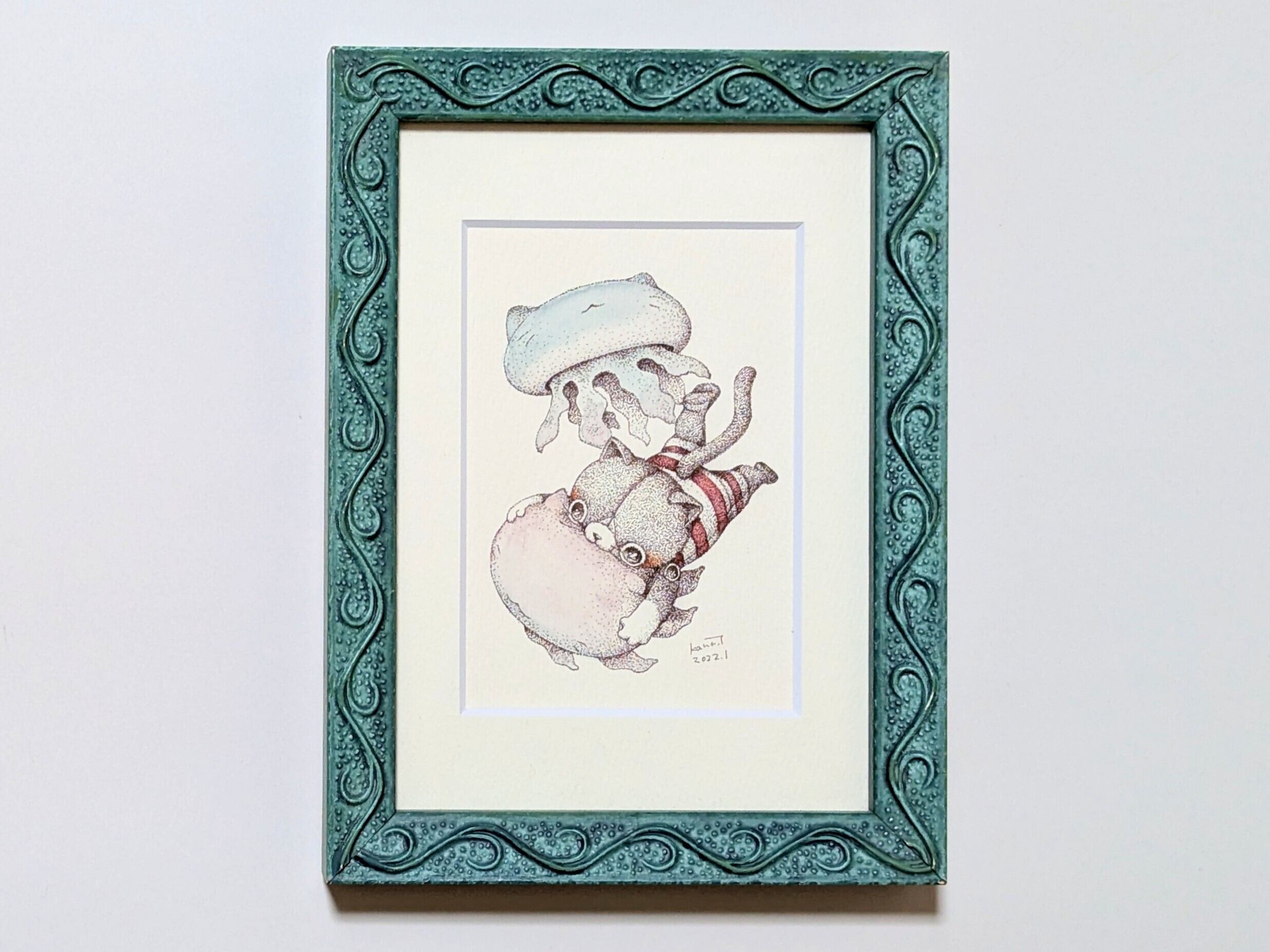ねこクラゲと共に 画材:ボールペン(シグノ)、水彩紙、顔彩絵の具 サイズ:約15.5cm×20.5cm(額装込み) 額装:木、アクリル [取り扱いについて] 飾る際には直射日光を避けていただき、保管する際には高温多湿を避けて暗所に保管をお願いします。 特に、直射日光が当たると退色が早く、長く作品を楽しめなくなる可能性がございます。