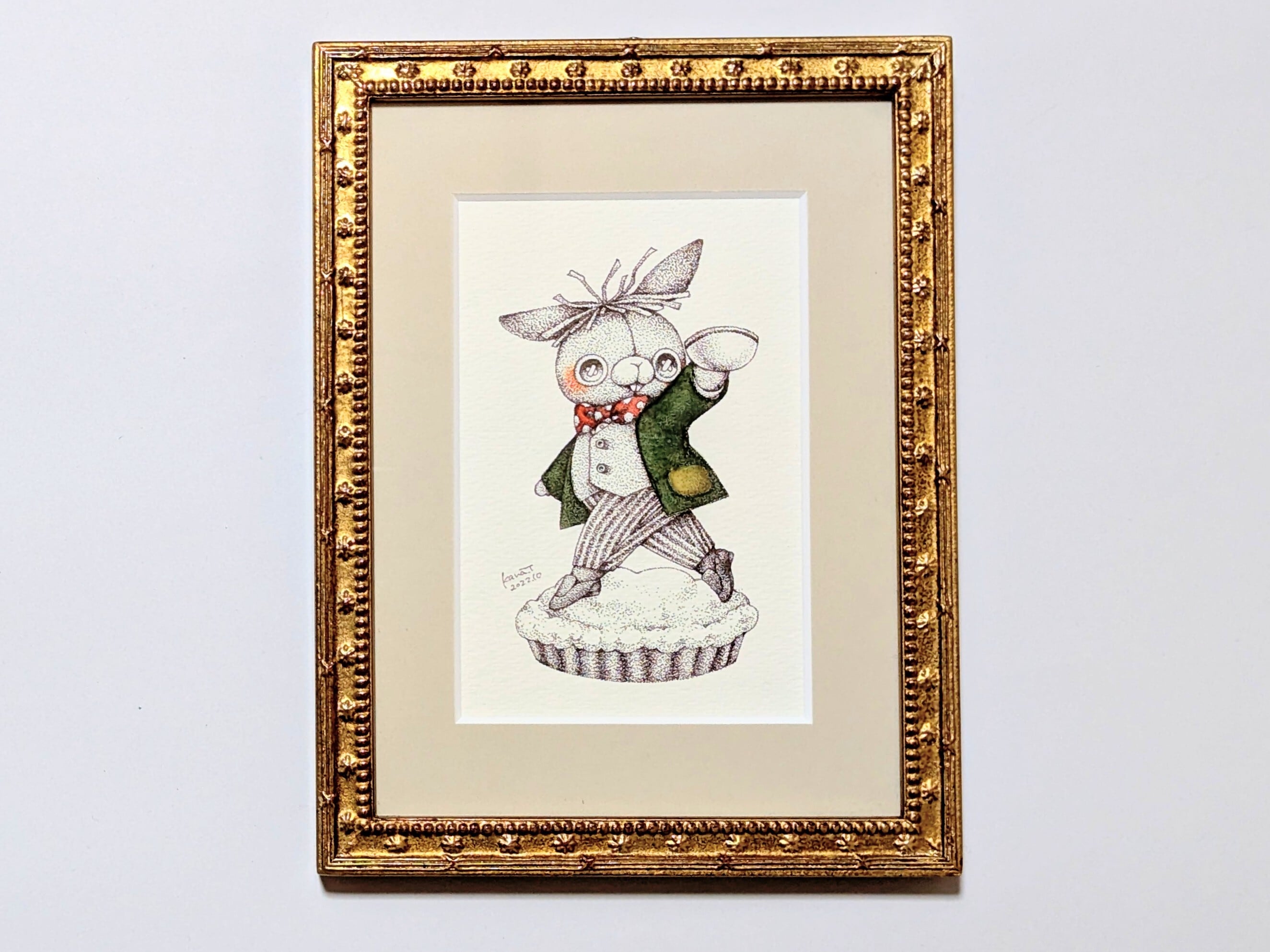 狂ったお茶会へようこそ 画材:ボールペン(シグノ)、水彩紙、顔彩絵の具 サイズ:約15.3cm×20.7cm(額装込み) 額装:木、アクリル [取り扱いについて] 飾る際には直射日光を避けていただき、保管する際には高温多湿を避けて暗所に保管をお願いします。 特に、直射日光が当たると退色が早く、長く作品を楽しめなくなる可能性がございます。