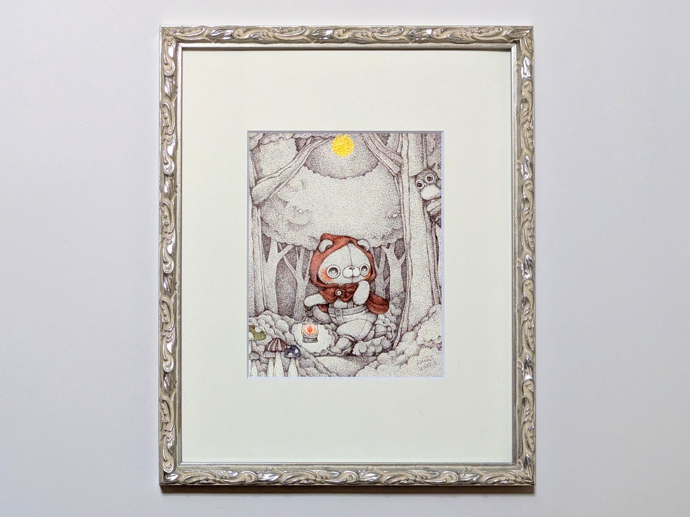 みんなで探索 画材:ボールペン(シグノ)、水彩紙、顔彩絵具 サイズ:約26.8cm×32.5cm(額装込み) 額装:木、アクリル [取り扱いについて] 飾る際には直射日光を避けていただき、保管する際には高温多湿を避けて暗所に保管をお願いします。 特に、直射日光が当たると退色が早く、長く作品を楽しめなくなる可能性がございます。