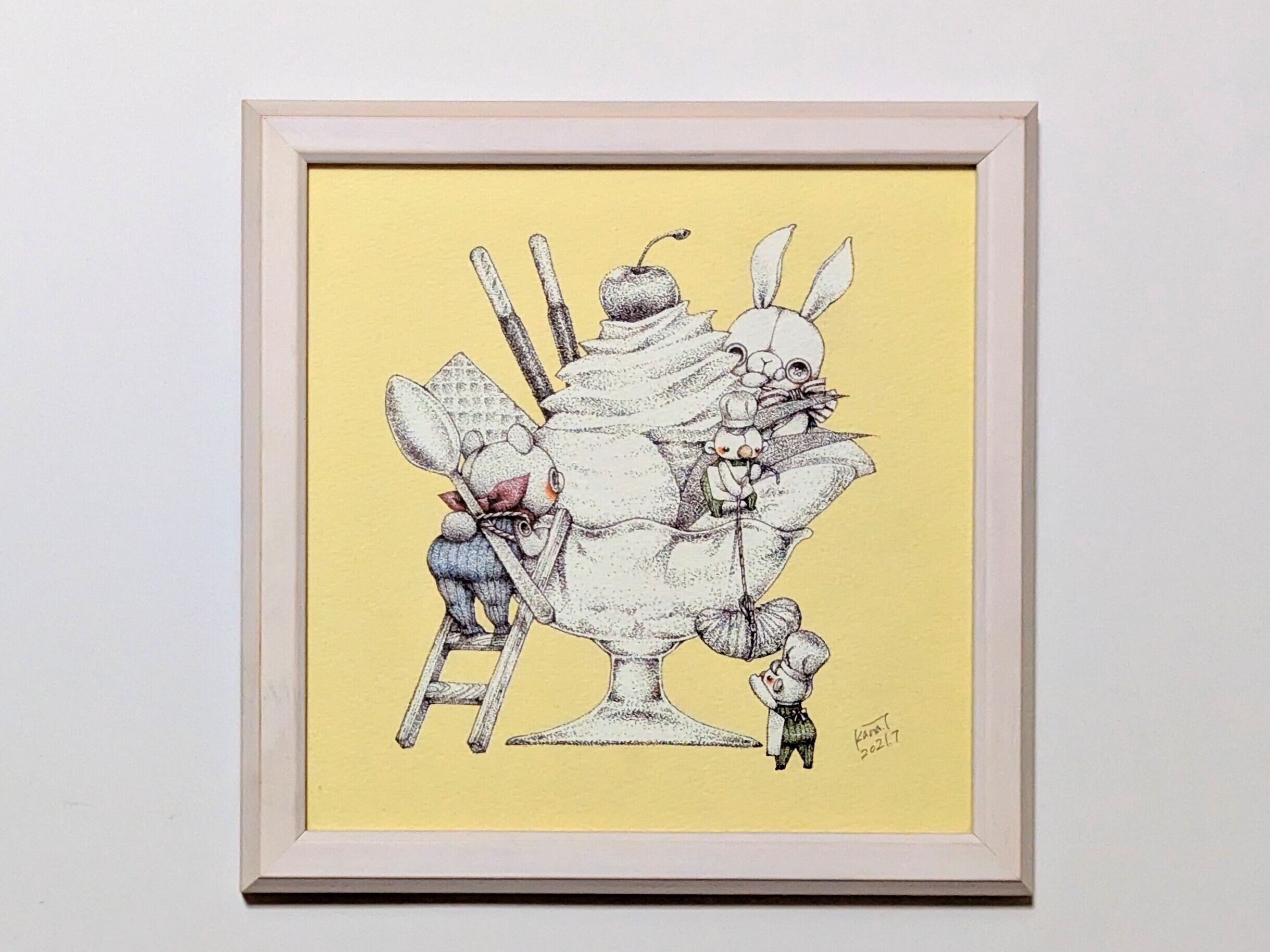 作ったそばから食べていく 画材:ボールペン(シグノ)、水彩紙 サイズ:約20cm×20cm(額装込み) 額装:木、アクリル [取り扱いについて] 飾る際には直射日光を避けていただき、保管する際には高温多湿を避けて暗所に保管をお願いします。 特に、直射日光が当たると退色が早く、長く作品を楽しめなくなる可能性がございます。