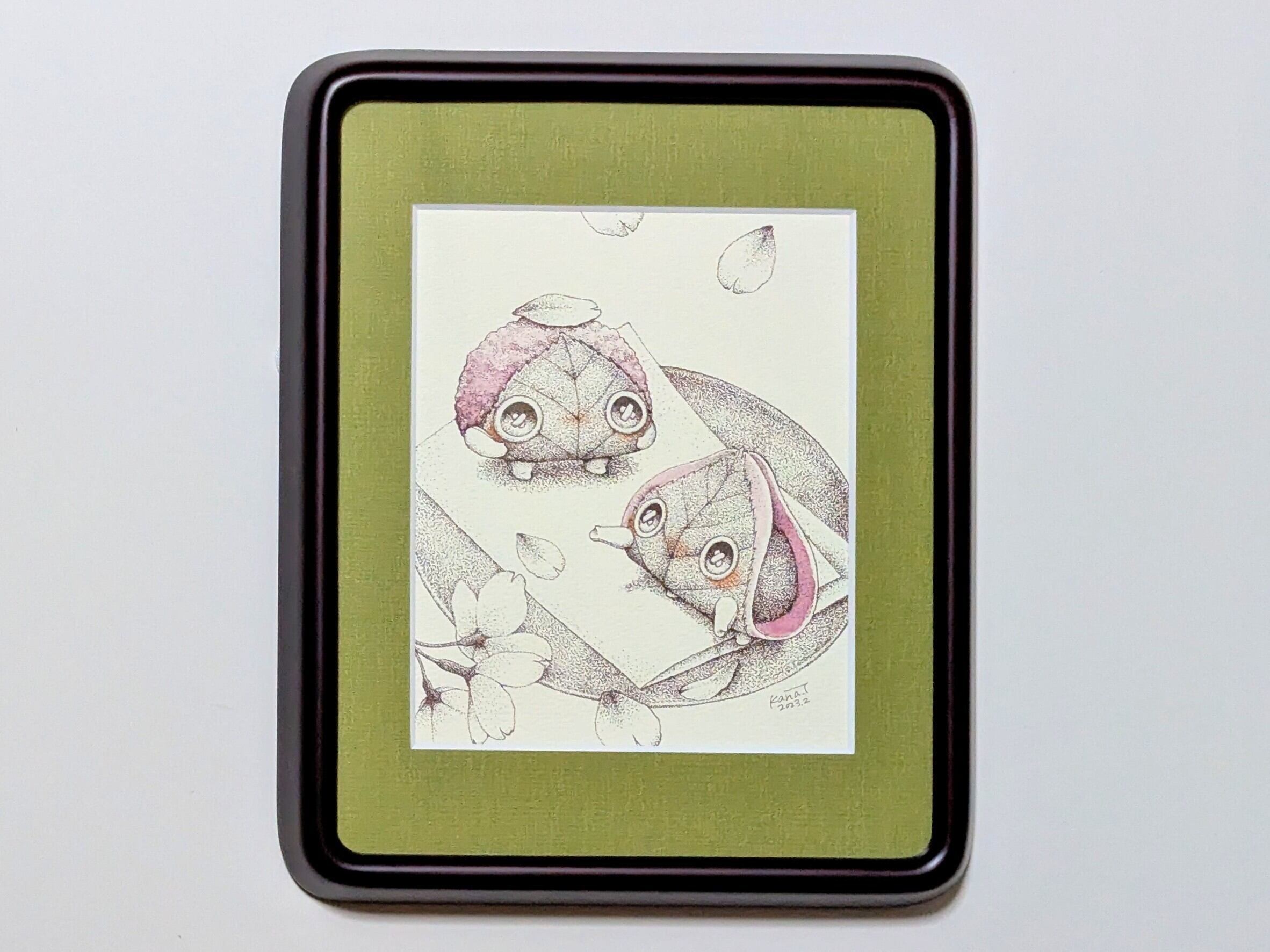お揃いでかわいいね 画材:ボールペン(シグノ)、水彩紙 サイズ:約22.5cm×28cm(額装込み) 額装:木、アクリル [取り扱いについて] 飾る際には直射日光を避けていただき、保管する際には高温多湿を避けて暗所に保管をお願いします。 特に、直射日光が当たると退色が早く、長く作品を楽しめなくなる可能性がございます。