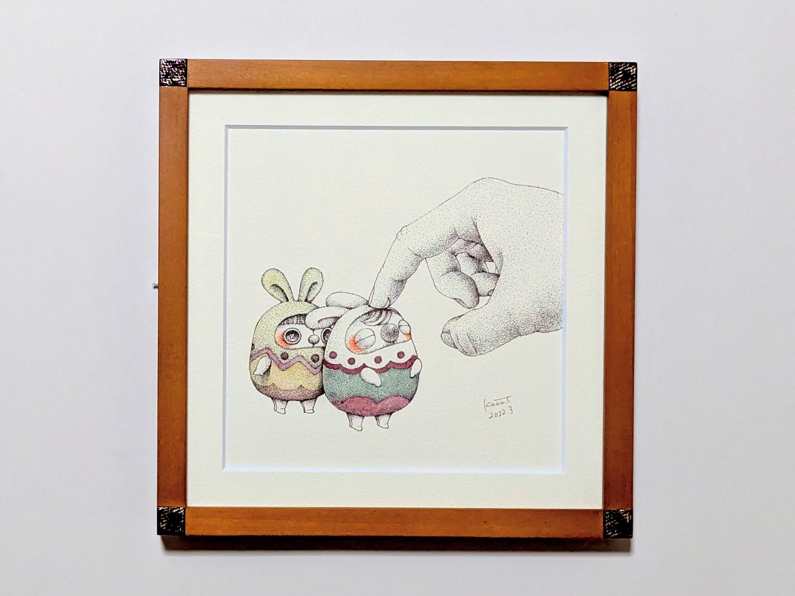 じゅんばんこ 画材:ボールペン(シグノ)、水彩紙、顔彩絵の具 サイズ:約22.7cm×22.7cm(額装込み) 額装:木、アクリル [取り扱いについて] 飾る際には直射日光を避けていただき、保管する際には高温多湿を避けて暗所に保管をお願いします。 特に、直射日光が当たると退色が早く、長く作品を楽しめなくなる可能性がございます。
