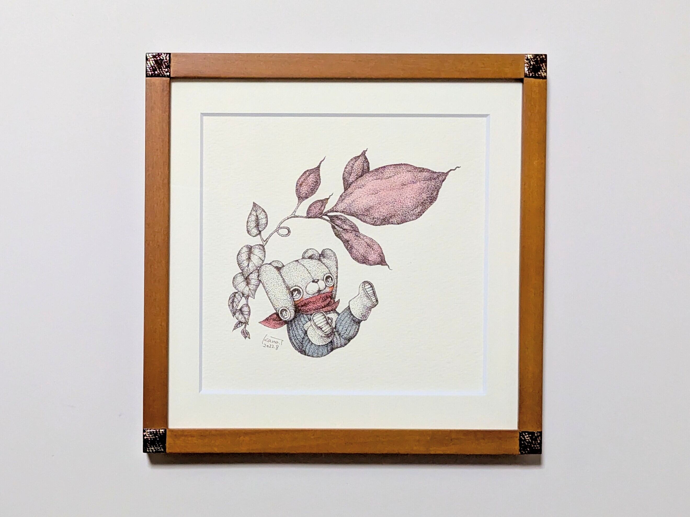 特大の焼き芋を作るぞ 画材:ボールペン(シグノ)、水彩紙、顔彩絵の具 サイズ:約22.7cm×22.7cm(額装込み) 額装:木、アクリル [取り扱いについて] 飾る際には直射日光を避けていただき、保管する際には高温多湿を避けて暗所に保管をお願いします。 特に、直射日光が当たると退色が早く、長く作品を楽しめなくなる可能性がございます。